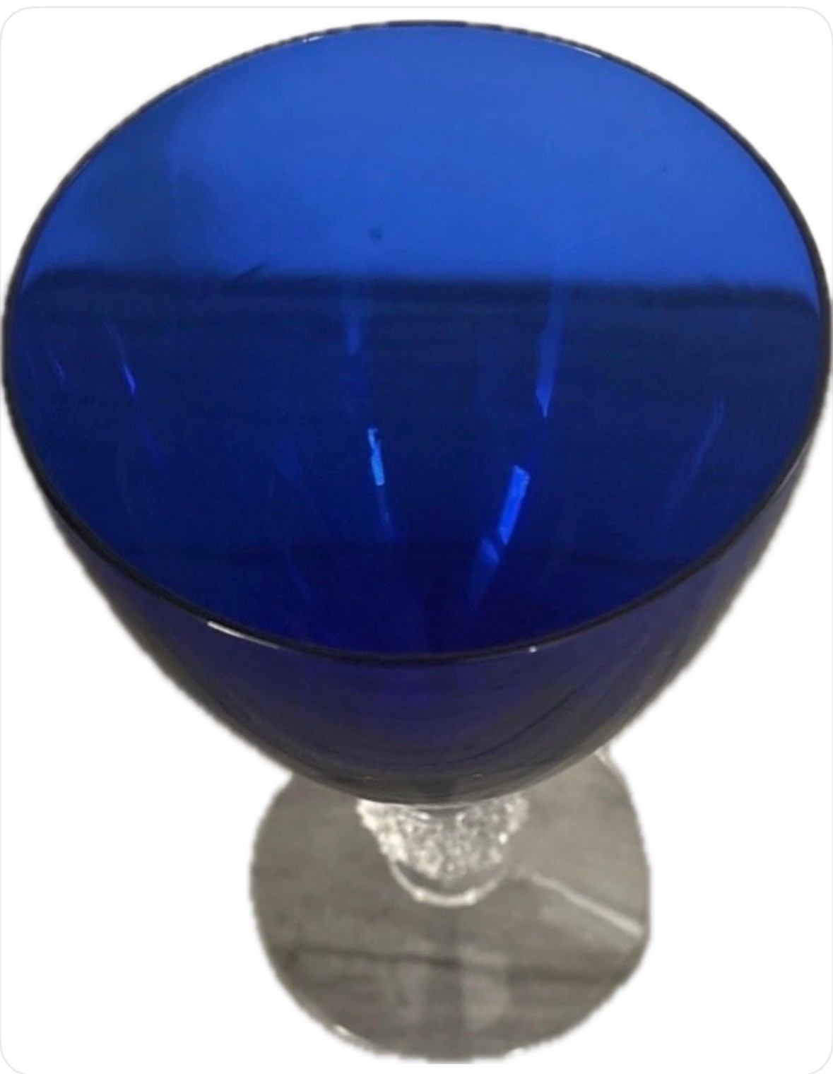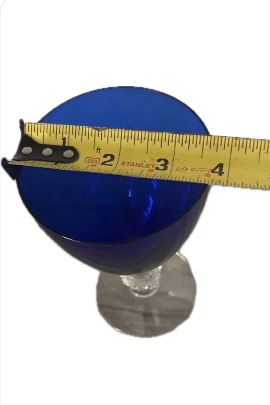 These vintage Morgantown cobalt blue water goblet is a 6" tall, 12oz capacity round glass drinkware piece with a golf ball stem design. Made in the United States during the 1960s, this Mid-Century Modern piece is perfect for all occasions and would make a lovely addition to any collection of American-themed glassware. The glossy finish and hand-blown production style add to its unique charm.