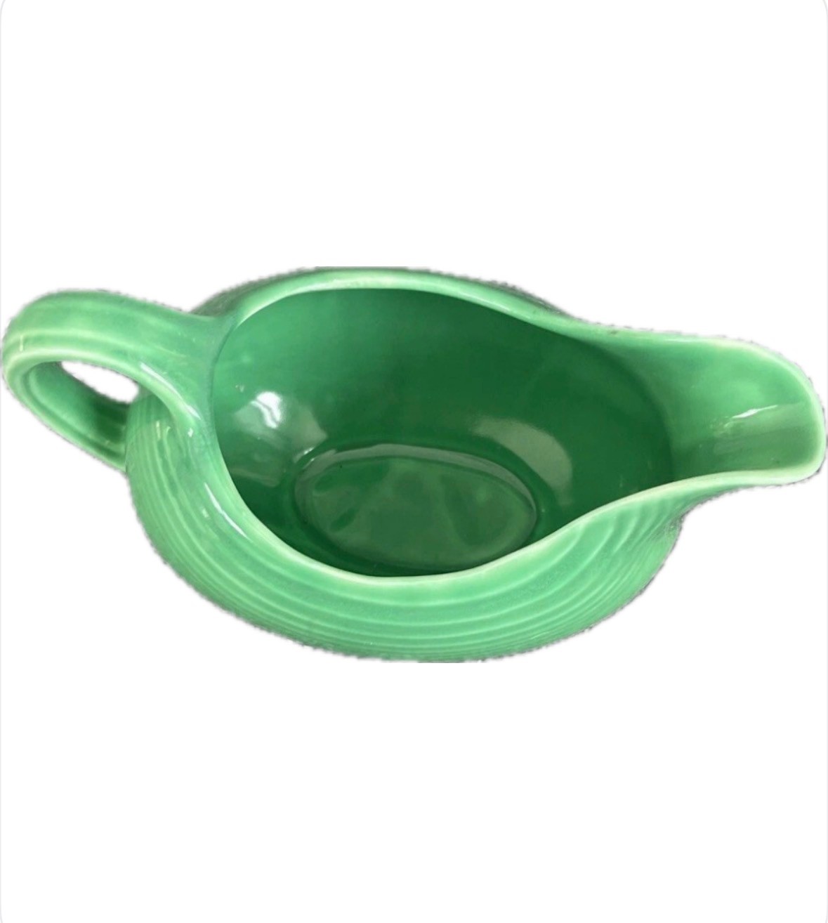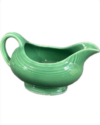 This vintage Homer Laughlin Fiestaware gravy/sauce boat in Sea Mist Green is an original Art Deco piece from the 1940s. Made of ceramic with a glossy finish, it is part of the Riviera product line. The American-made piece features a Century pattern and is a collectible item perfect for adding a touch of retro charm to any table setting.