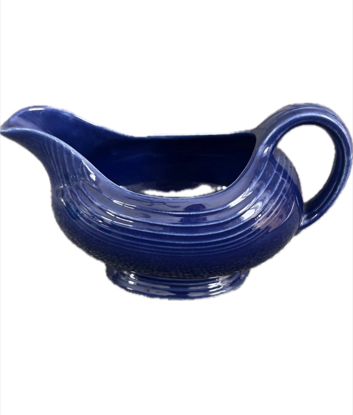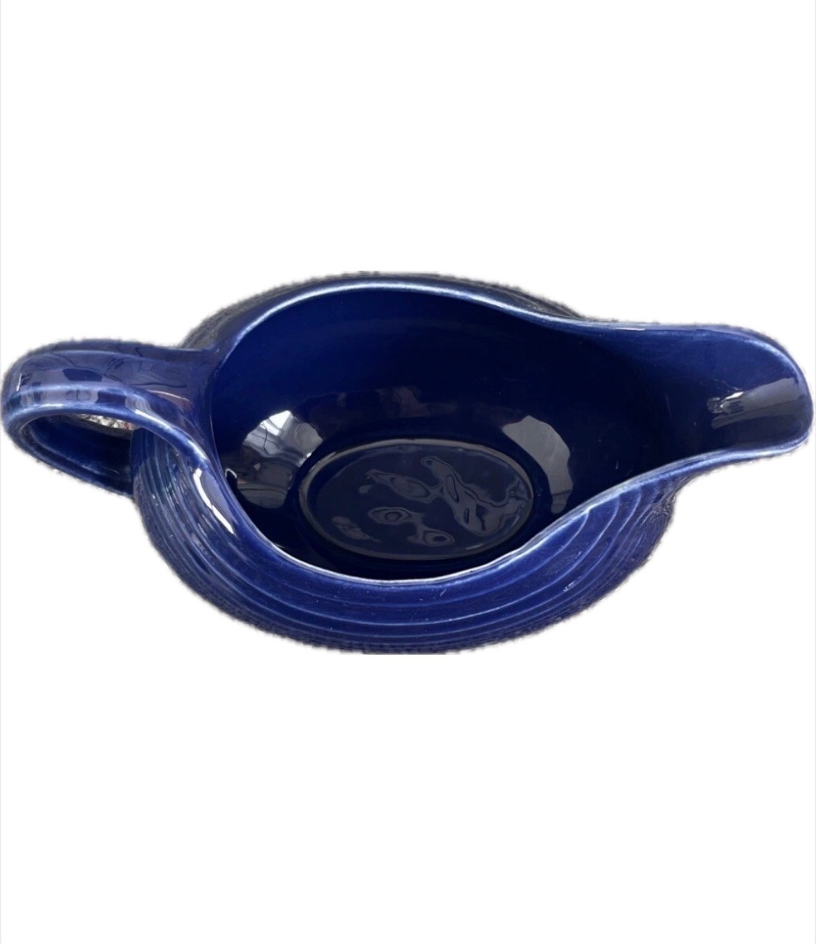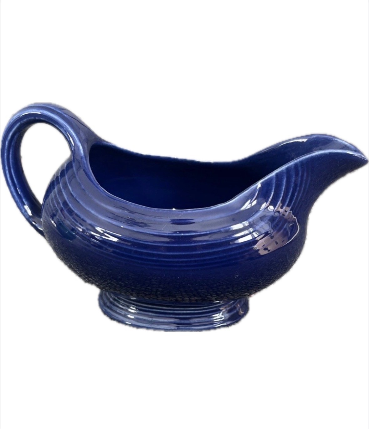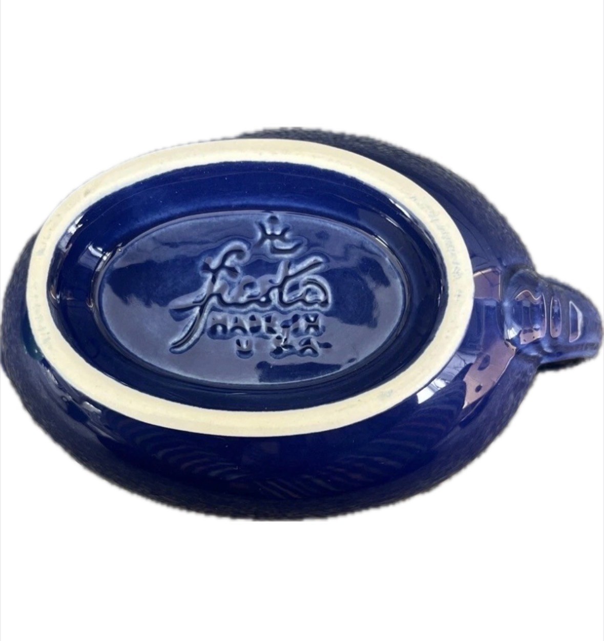 This Fiestaware Sauceboat in Cobalt Blue is an oval-shaped gravy boat made of clay. It is an original vintage piece from the 1940s, produced by hlc in the United States. The sauceboat has an Art Deco style, features an impressed backstamp, and is finished with lead glaze. It measures 8" in length and weighs 1lb. 4oz. The item is part of the Fiesta product line and is dishwasher safe.