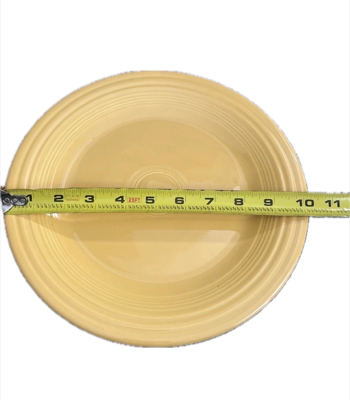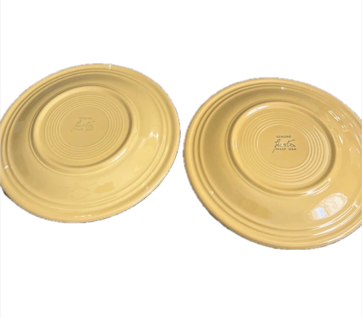 This is a set of two vintage Fiestaware dinner plates in a sunny sunflower yellow color. The plates are round in shape, made of ceramic, and measure 10.5 inches in diameter. They feature a glossy finish. Produced by Homer Laughlin in the United States, these original art pottery plates are part of the Fiesta product line. The backstamp is printed on the plates.