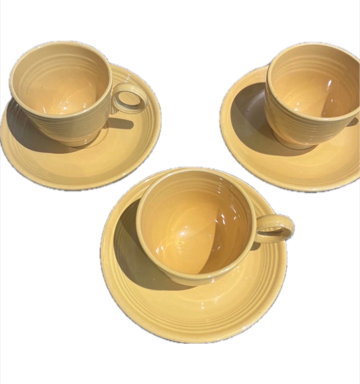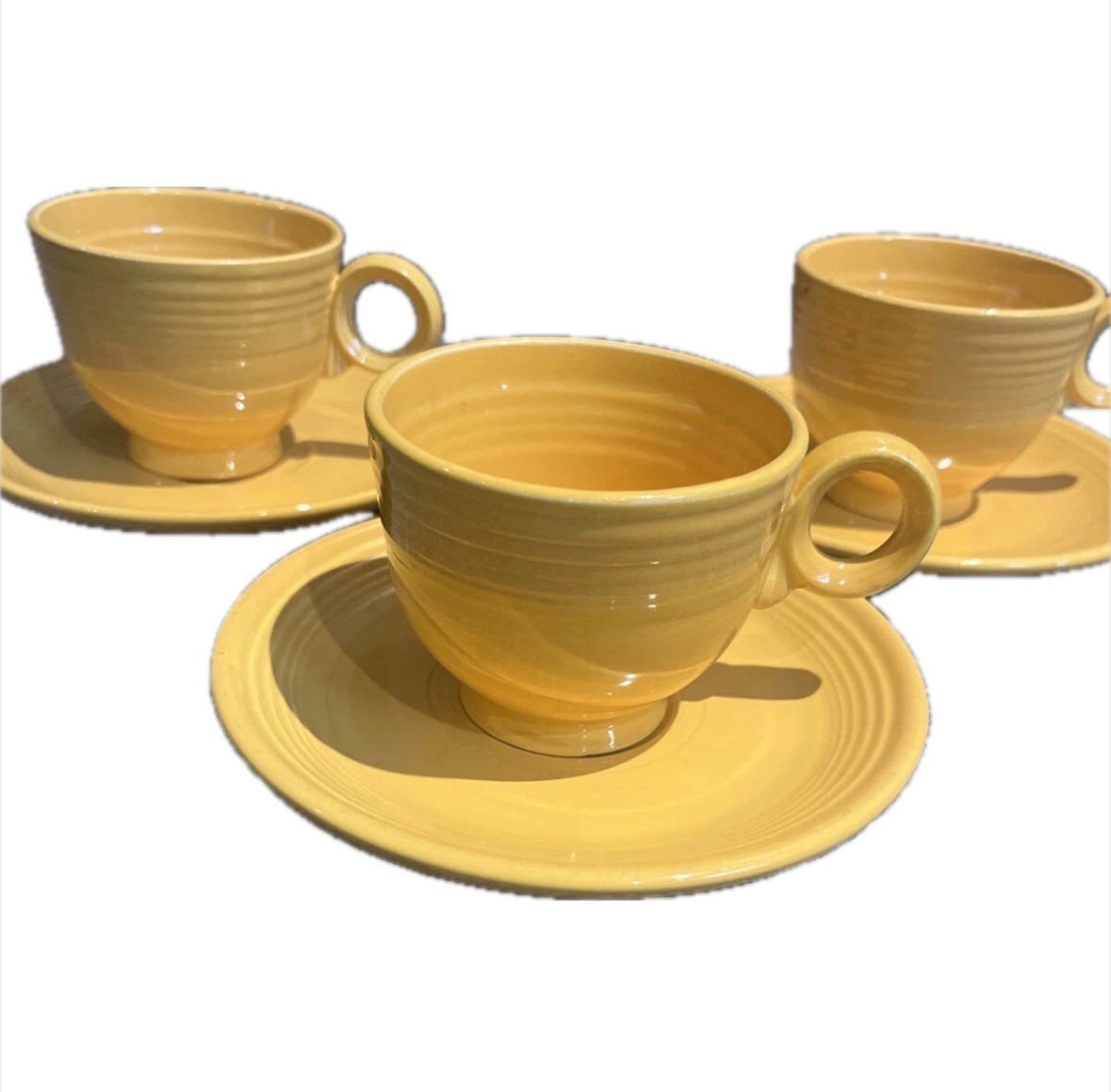This set includes a six-piece tea cup and saucer in a vibrant Sunflower Yellow color from the Fiesta line by Homer Laughlin. The round-shaped cups have a 6 oz capacity, are suitable for hot beverages, and feature a handle. They are microwave and dishwasher safe, with a lead-free glaze finish. Ideal for all occasions, this Art Deco style set is made of ceramic in the USA.