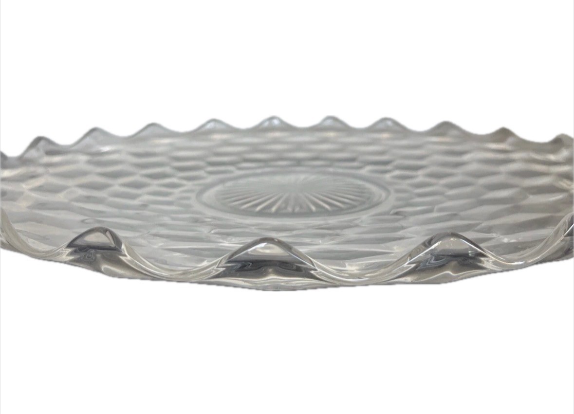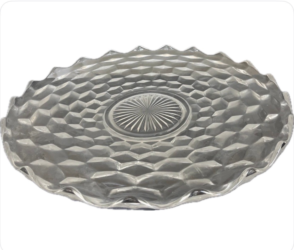 This 14" FOSTORIA American Cubist Cube Clear Glass Large Round Serving Platter is a vintage original piece, perfect for any party occasion. The elegant glass production style and American brand make it a unique addition to your collection. The platter has a round shape and a clear color, made of glass material.