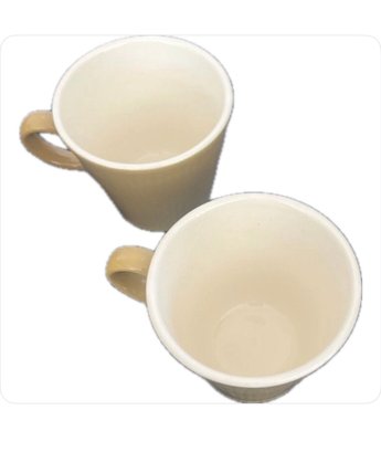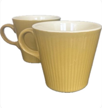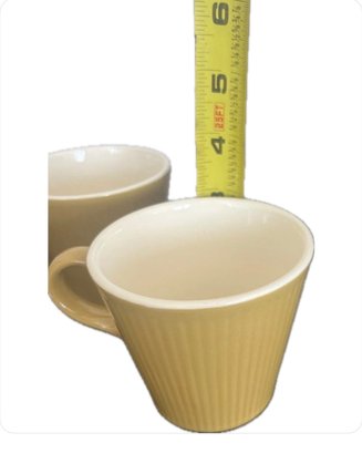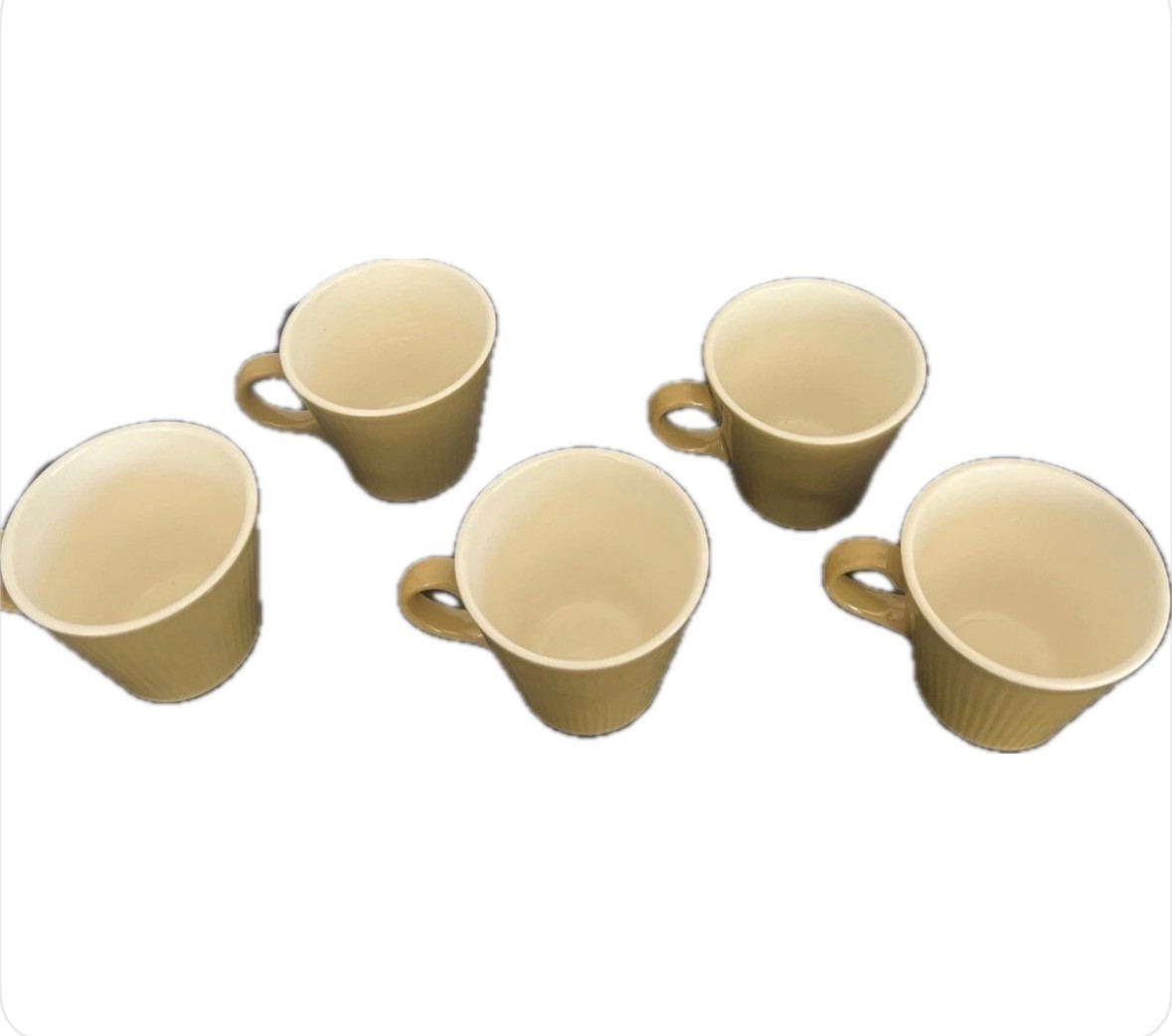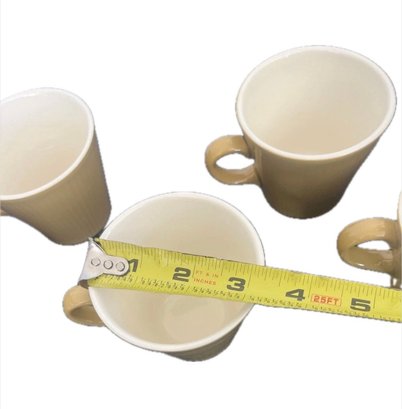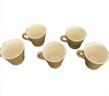 This is a set of five coffee or tea cups made by Homer Laughlin in the Scheffield Serenade pattern. The cups are vintage and were manufactured in California in the 1950s. They feature a gold color and a ceramic material, and are suitable for all occasions.