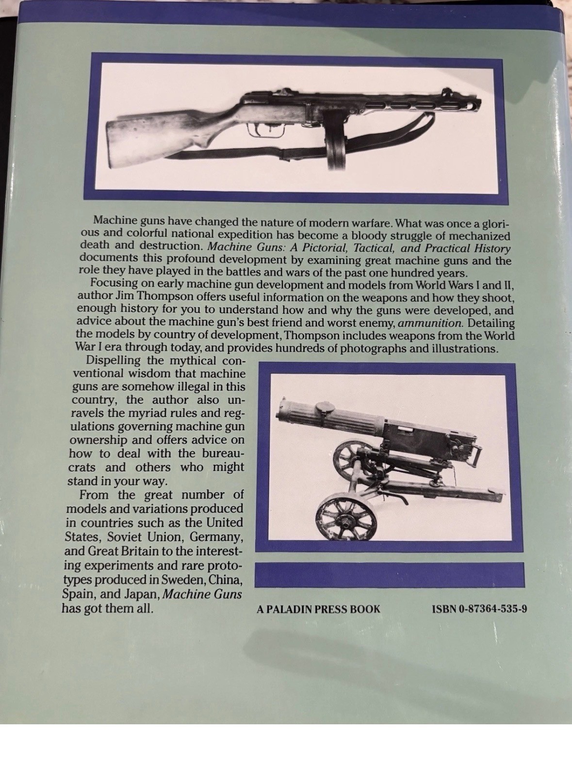 Machine Guns: A Pictorial Tactical & Practical History by Jim Thompson is a detailed book published in 1989 by Paladin Press. This trade paperback features illustrations and a comprehensive narrative on the history of machine guns. With 248 pages, this book is a valuable resource for those interested in military history and weaponry.