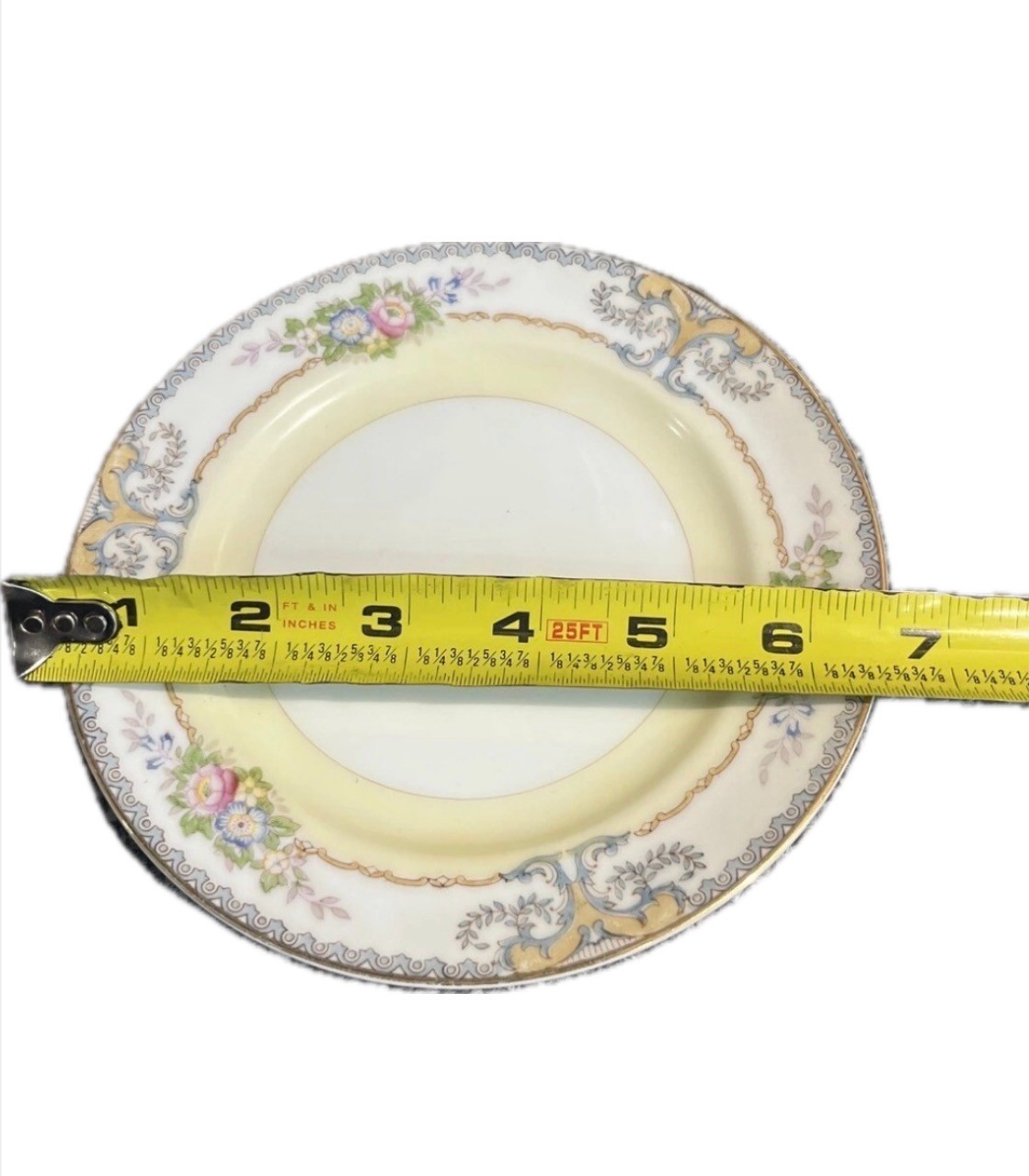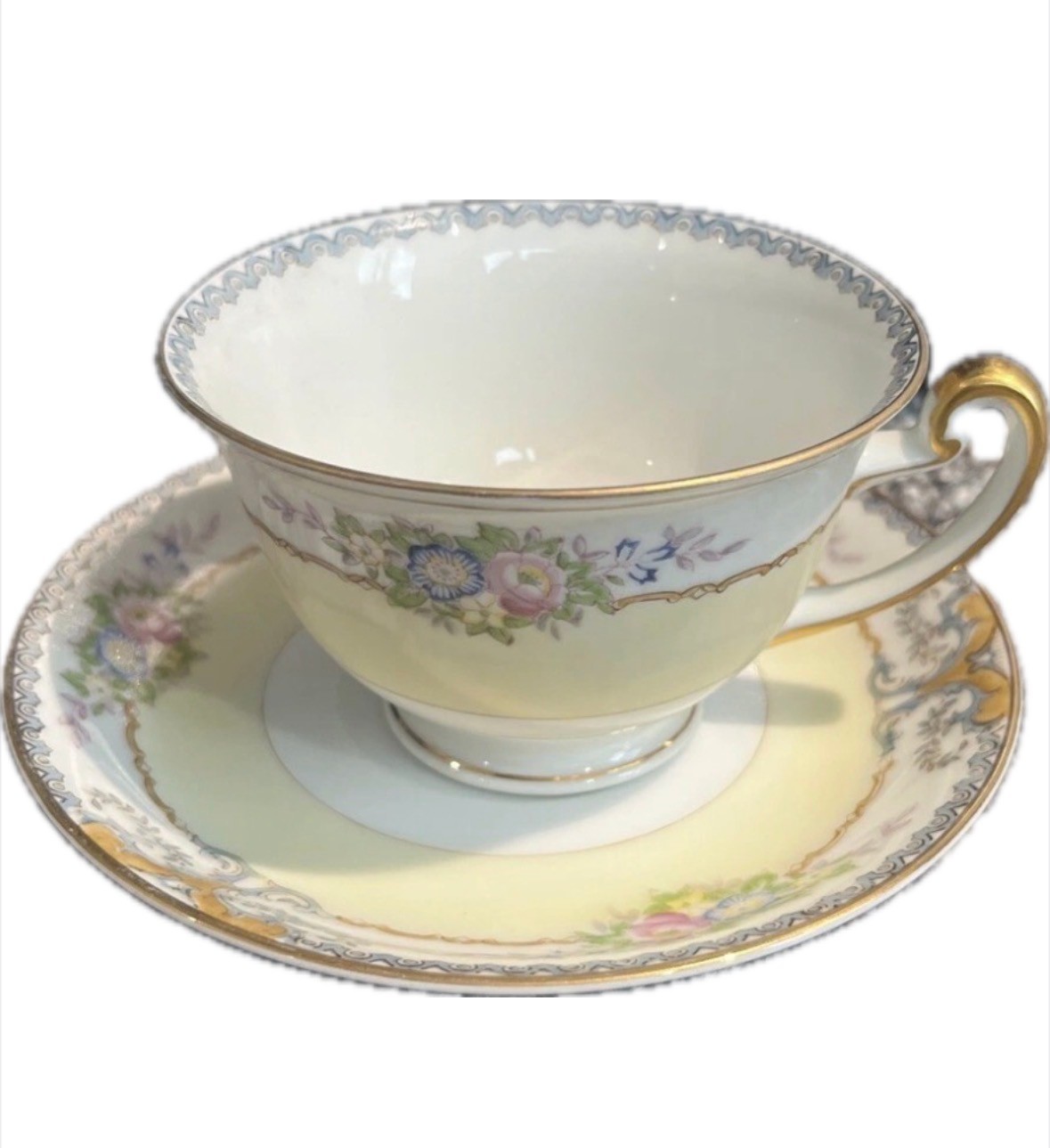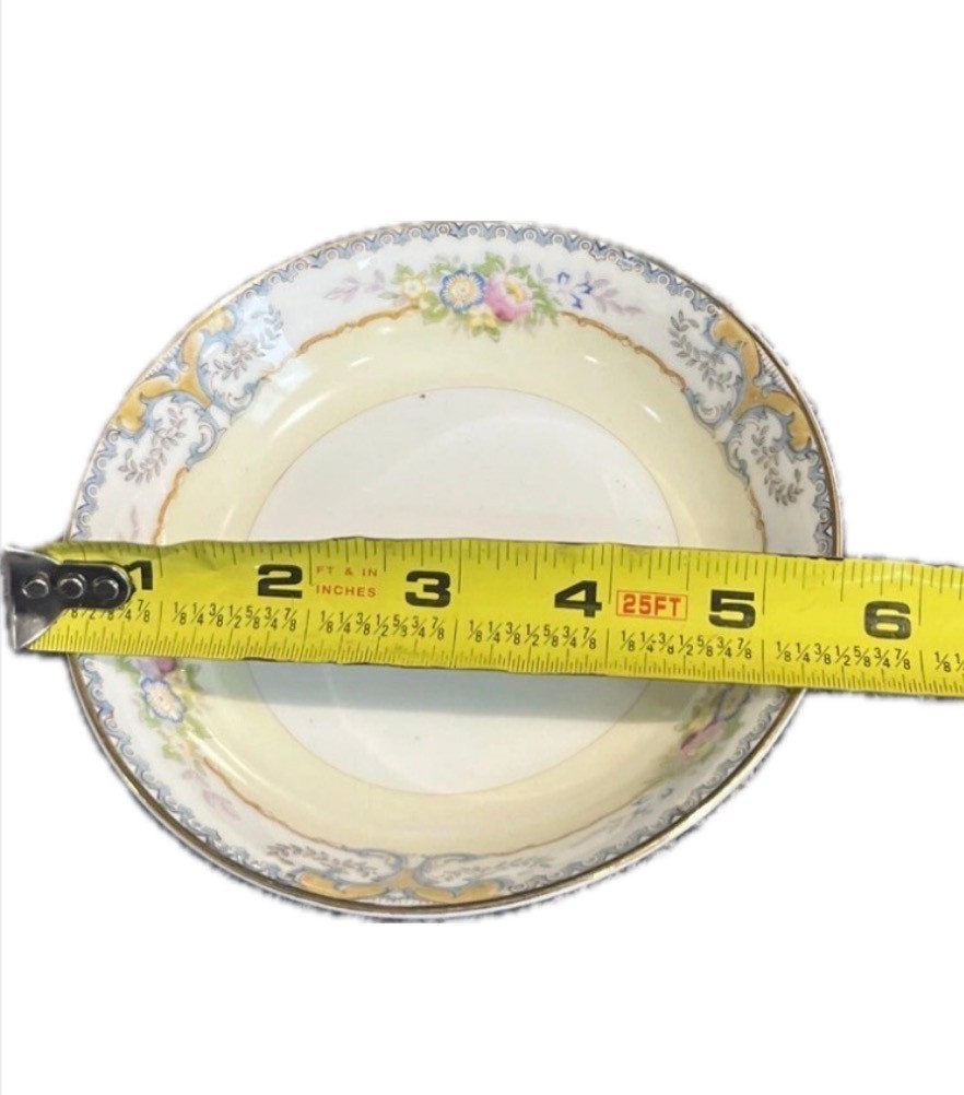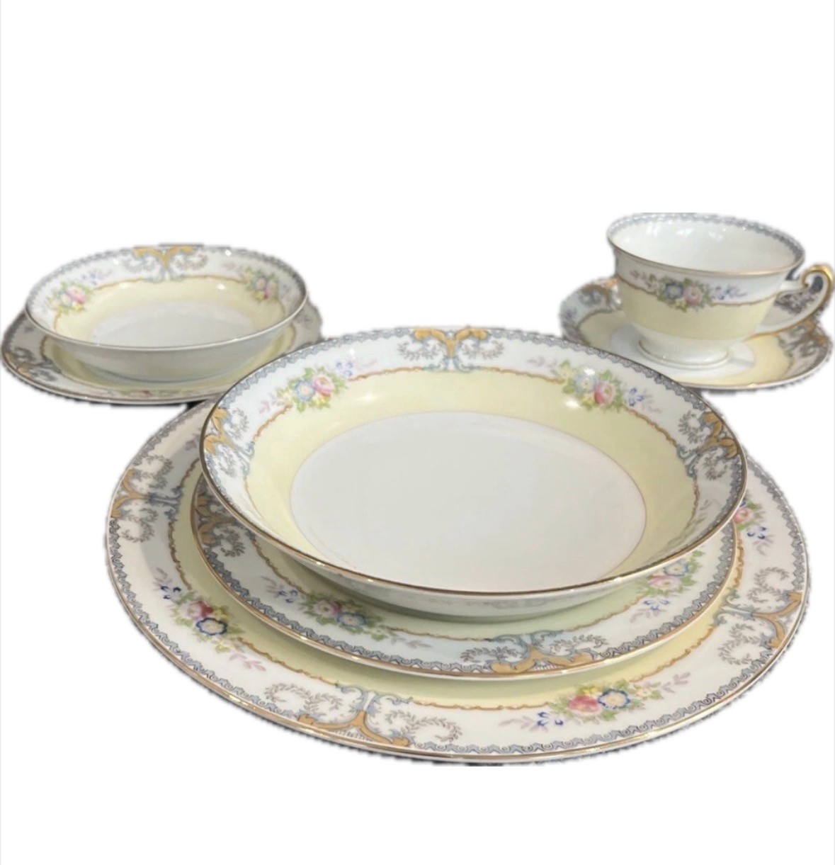 This is a vintage Meito China dinnerware set from Japan, manufactured in 1960. The complete set of six includes seven pieces featuring a floral pattern on multicolor porcelain. The pieces are round in shape and have a Victorian style. Each piece has a printed backstamp and a glossy finish. It consists of 6 dinner plates, 6 salad, 6 soup, 6 bread, 6 dessert plates, 6 tea cup with 6 saucer, perfect for all occasions.