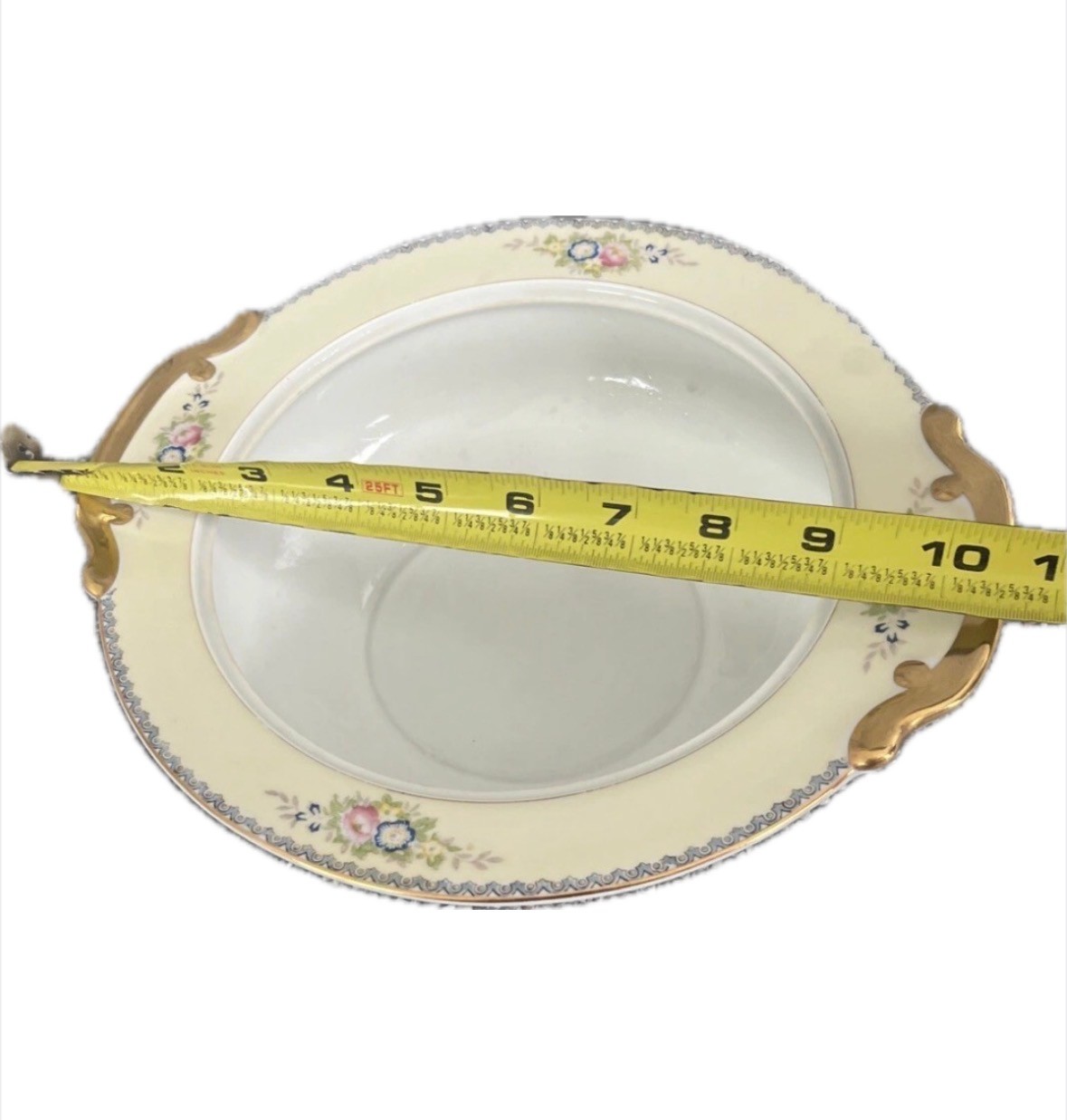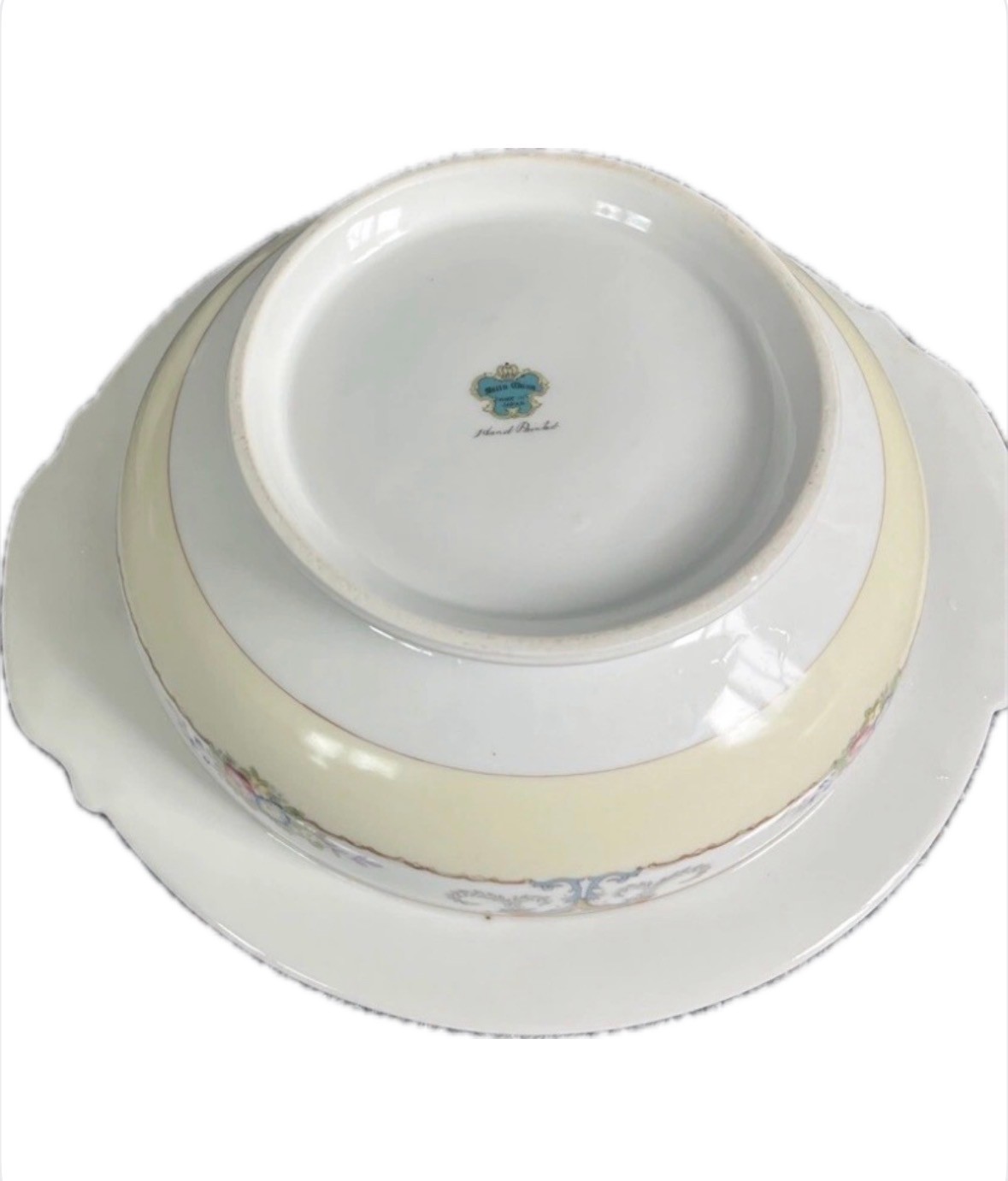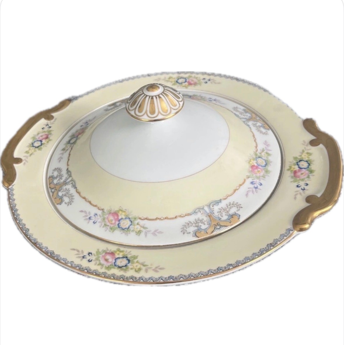 This is a vintage Meito China covered casserole dish in a white porcelain material with a floral pattern. It features painted flowers, a glossy finish, and a mid-century modern style. The dish has one compartment and a vintage design, making it a decorative and functional piece for serving or display.