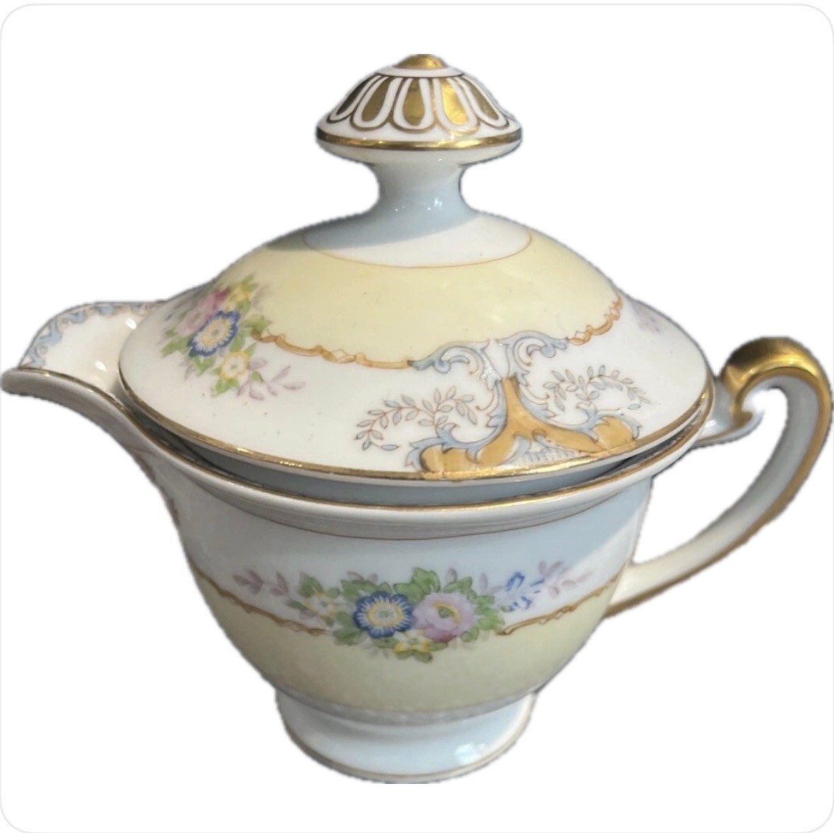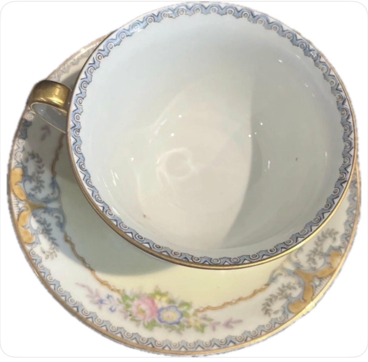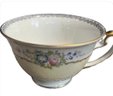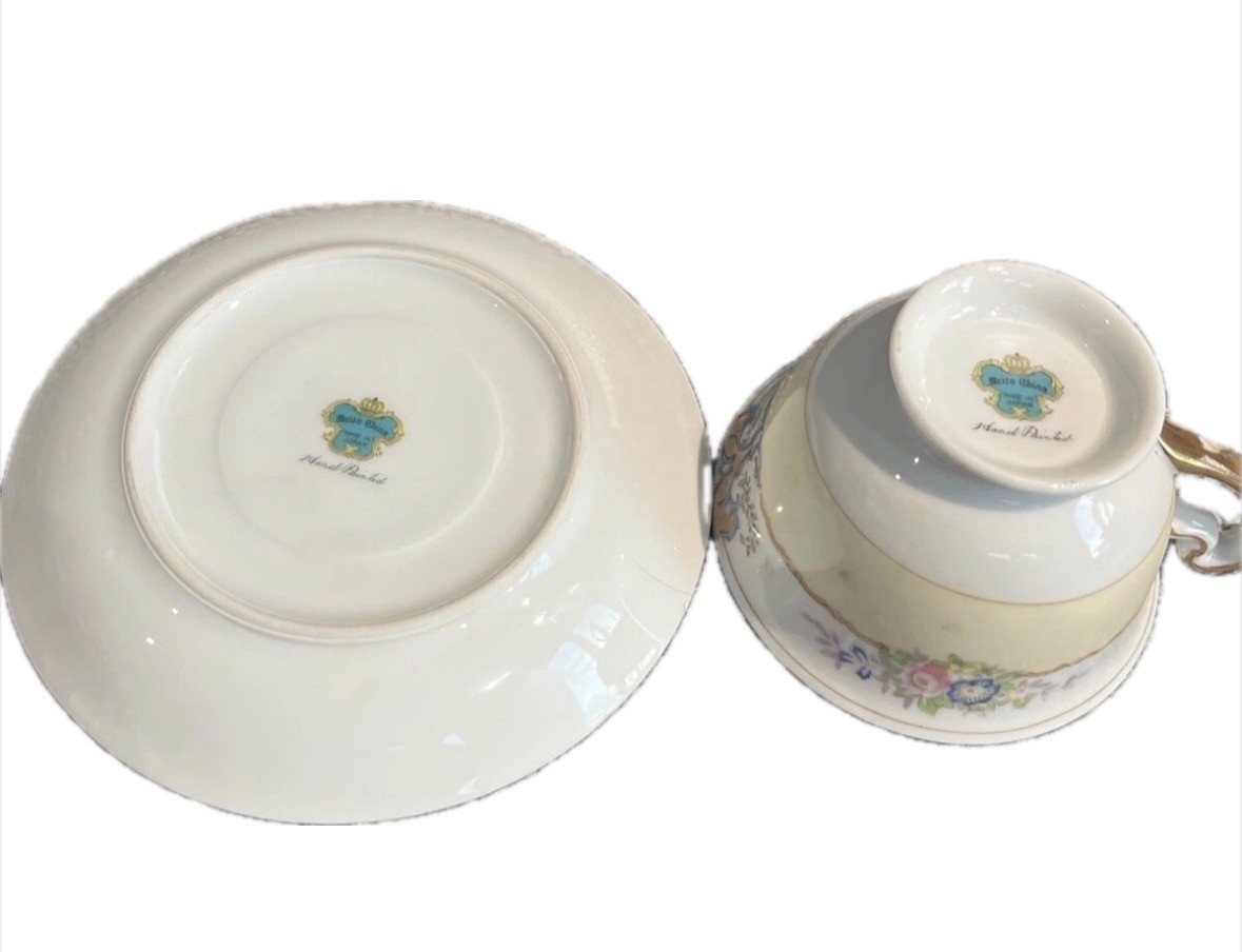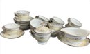 This is a vintage Meito China tea set from Japan, featuring a floral pattern on bone china. The set includes 24 pieces, including tea cups, saucers, a creamer, and a sugar bowl. The backstamp is printed on the items.