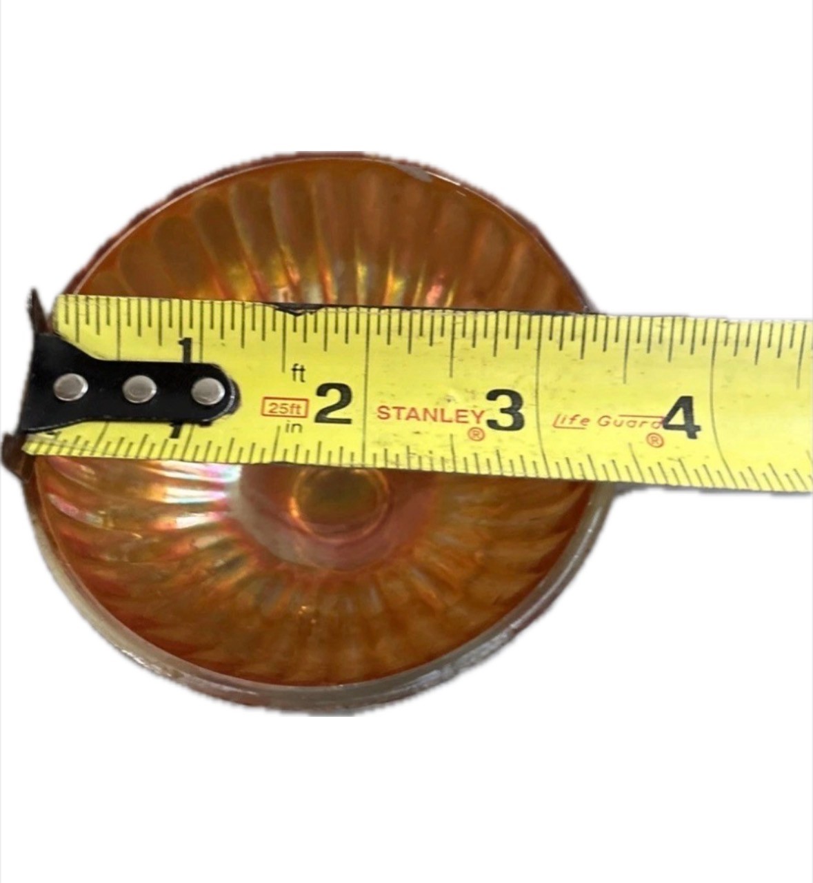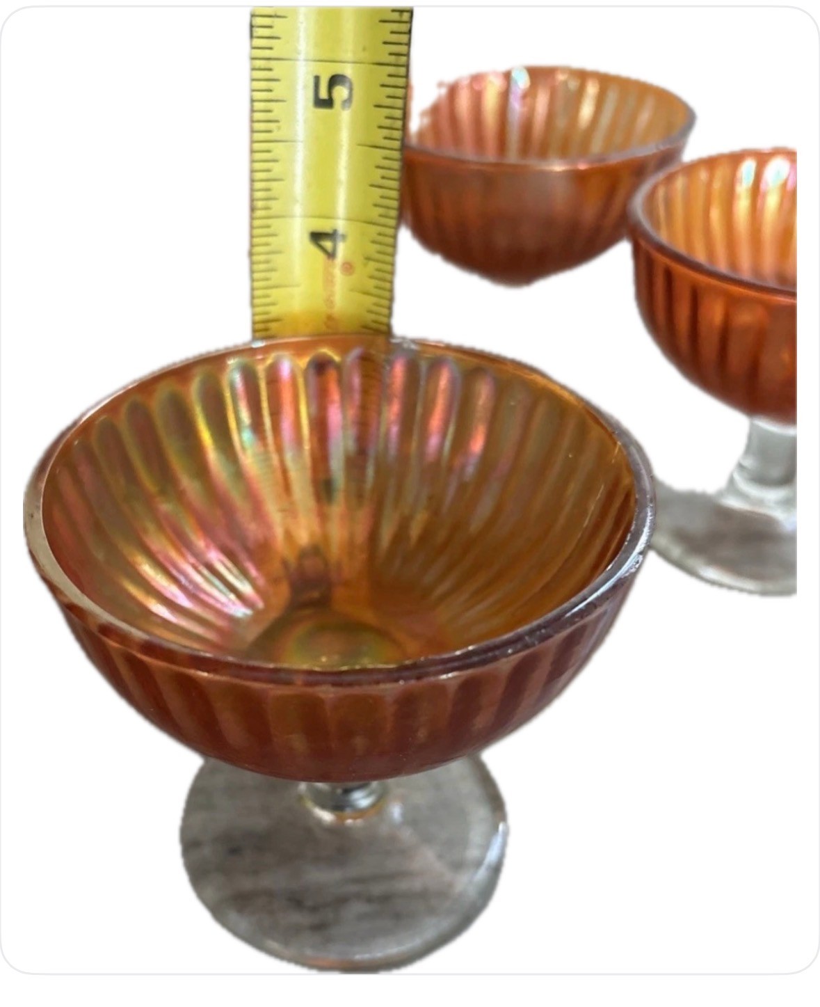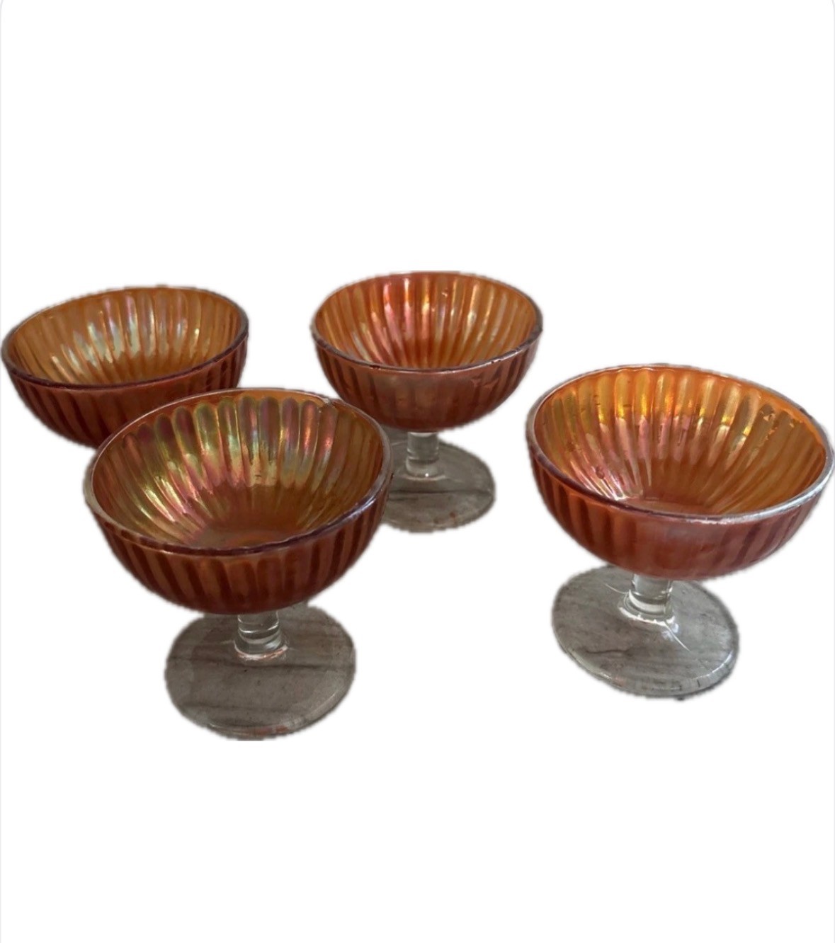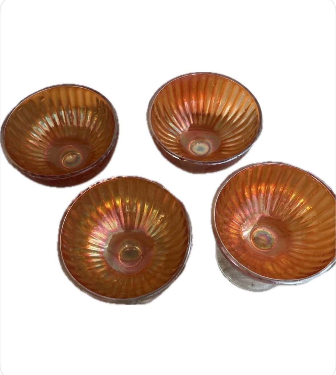 The product is a set of four vintage Imperial Marigold Carnival Glass sherbet cups with stems. These champagne/sherbet glasses feature a beautiful orange color and are made of carnival glass, showcasing a unique production style. Each bowl included in the set is a vintage original piece, adding a touch of nostalgia to any home bar or dining table. The Imperial Glass brand is known for its quality craftsmanship, making these glasses a charming and timeless addition to any collection.