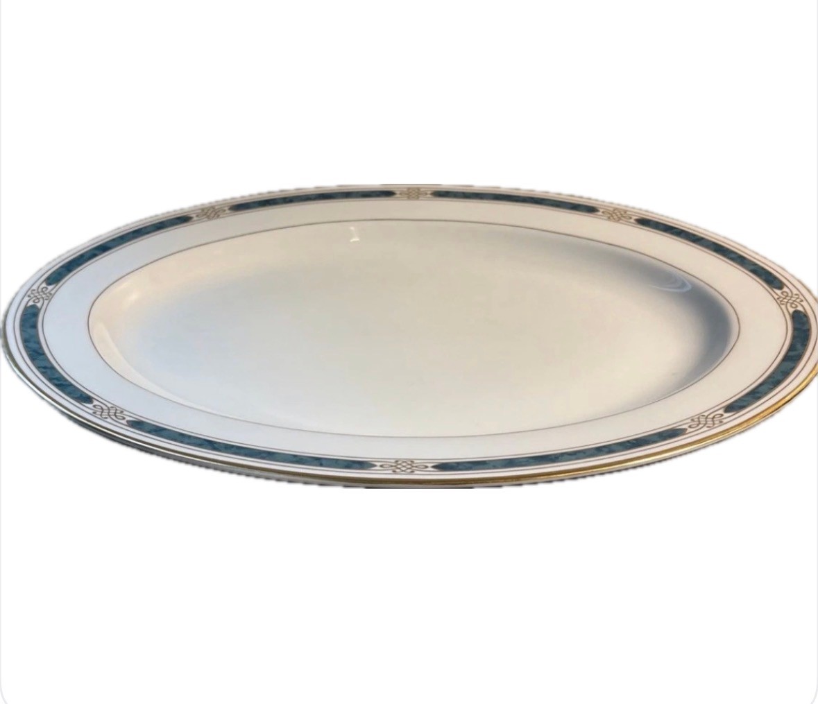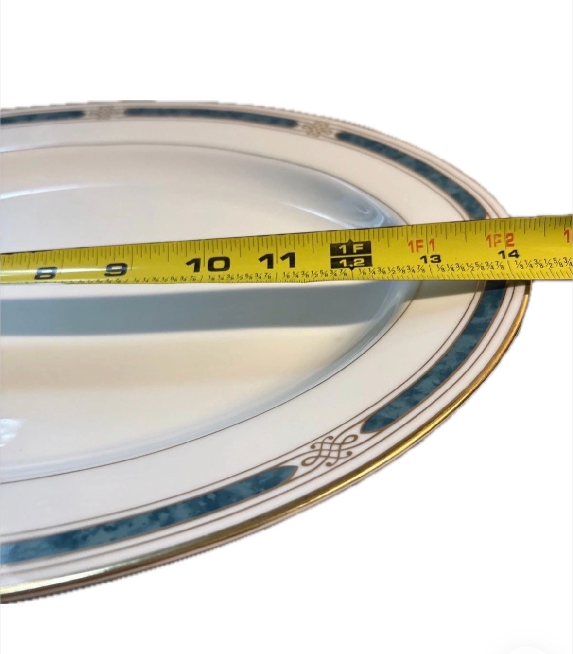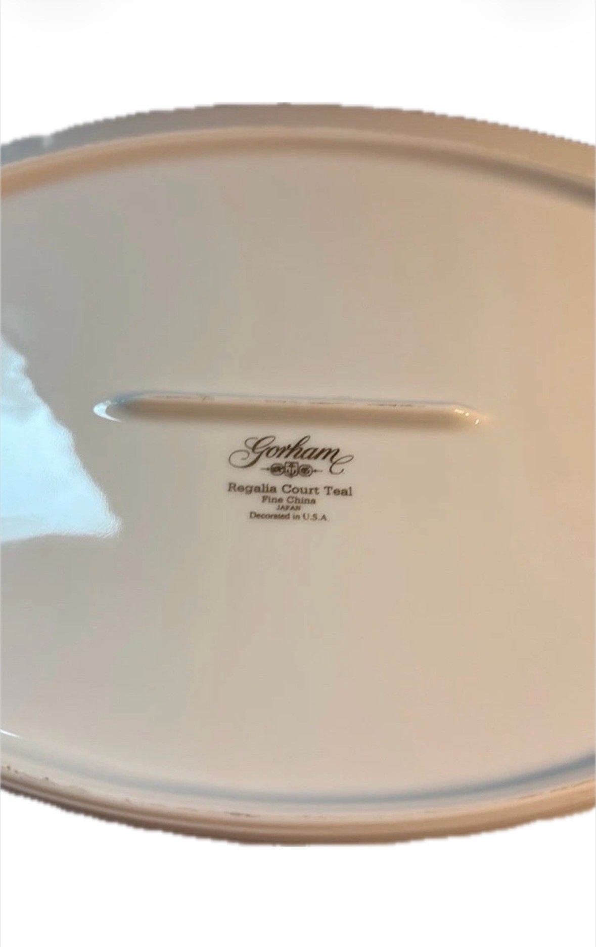 Elevate your dining experience with the Gorham Fine China Regalia Court Teal Oval Serving Platter. Crafted from premium fine china, this exquisite 14 1/2" platter showcases a timeless Regalia Court Teal pattern that brings a touch of elegance to any table setting. Its classic oval shape and rich teal color make it a versatile choice for both formal events and everyday use. Proudly made in Japan, this serving platter is a testament to the craftsmanship and quality that Gorham is known for. Whether you're serving up a gourmet meal or displaying this beautiful piece as part of your decor, it's sure to be a cherished addition to your collection.
