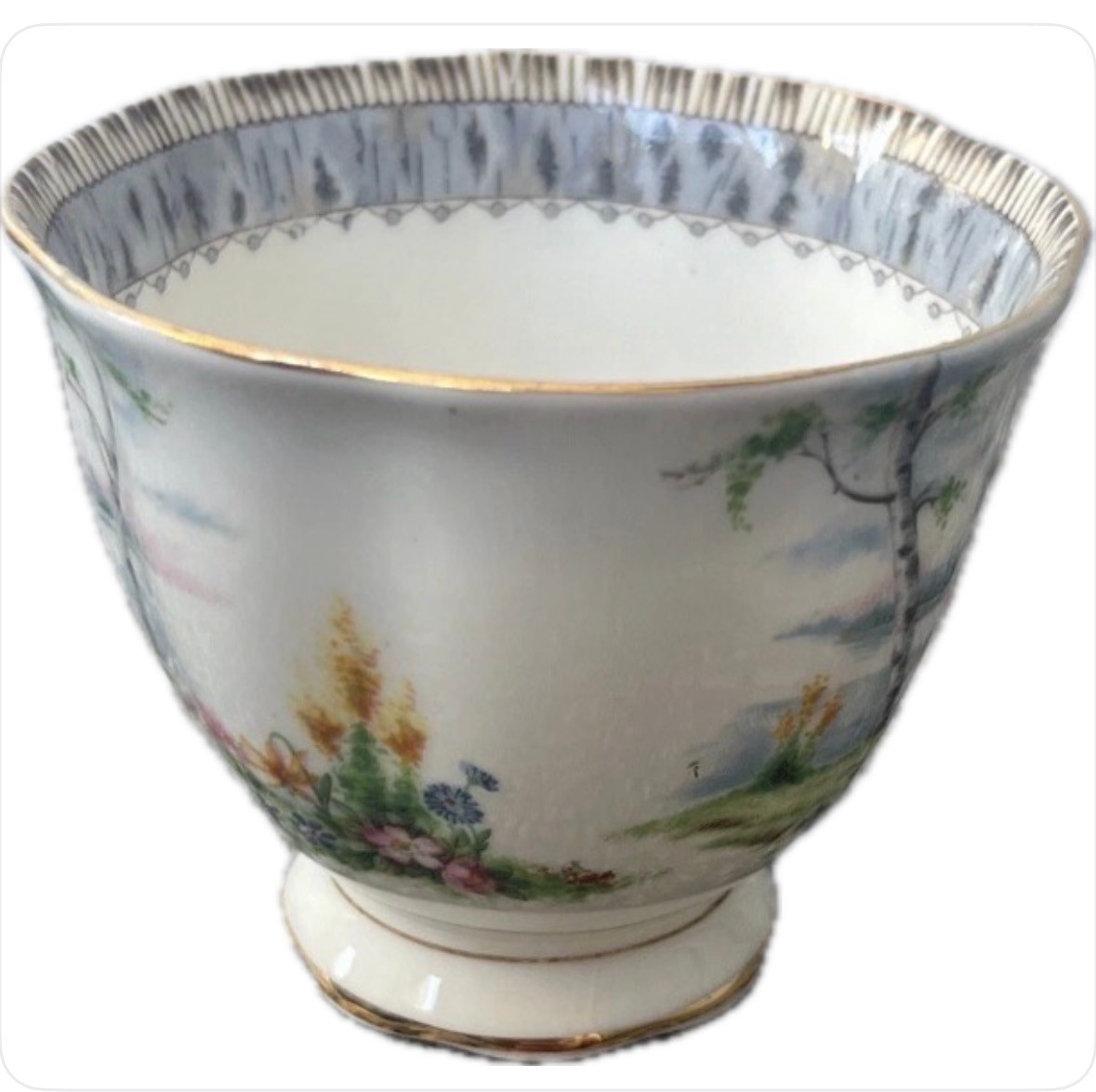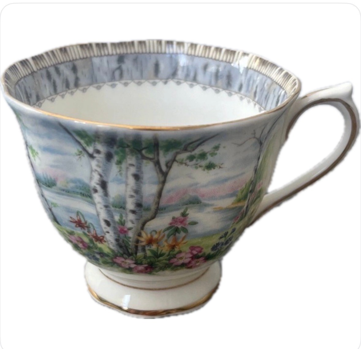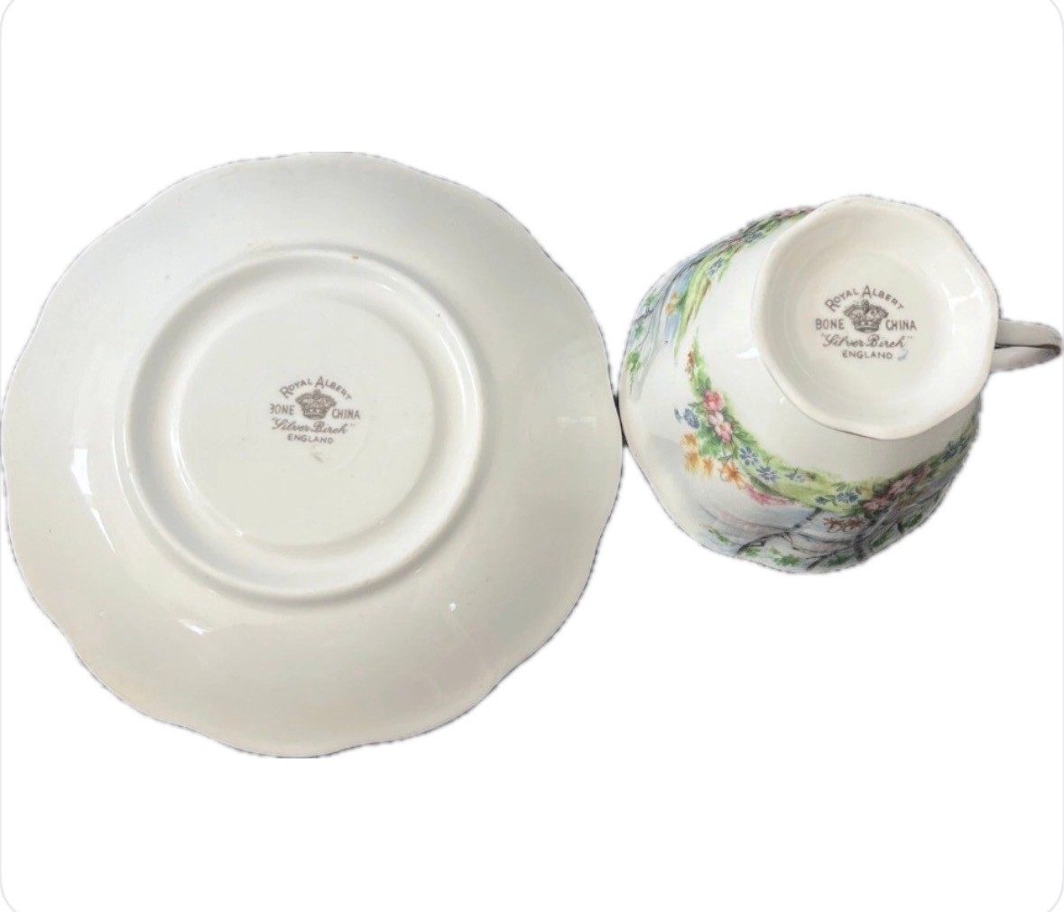 This is a vintage Royal Albert Bone China Silver Birch Tea Cup and Saucer set from England. The set features a silver color and a pattern of Silver Birch trees. It is made of bone china and was produced in the 1950s using art pottery techniques. The 8 tea cup and 8 saucer set is an original piece.