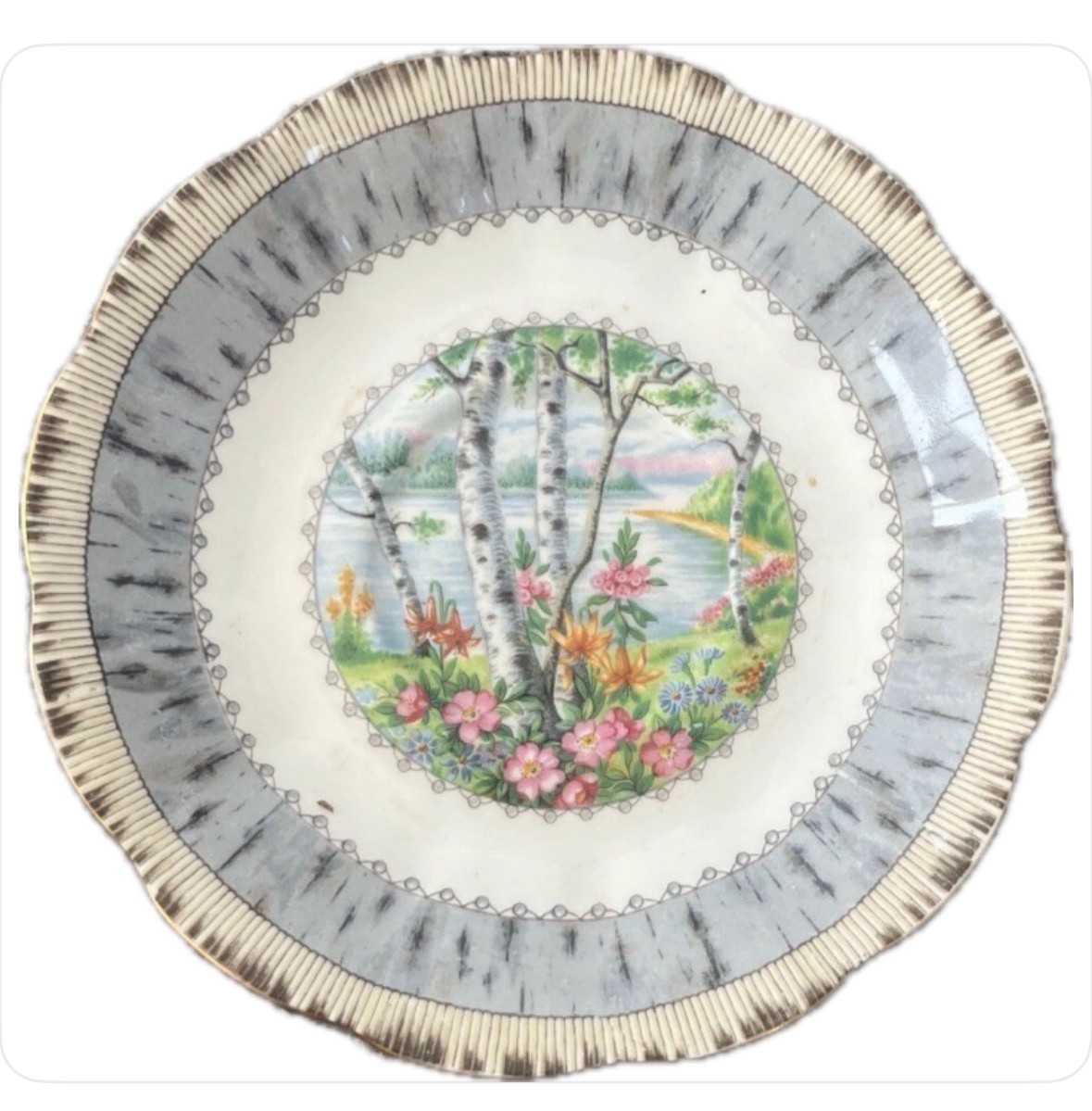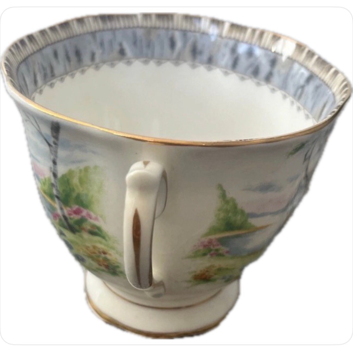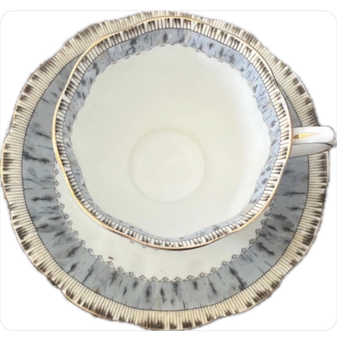 This is a vintage Royal Albert Bone China Silver Birch Tea Cup and Saucer set from England. The set features a silver color and a pattern of Silver Birch trees. It is made of bone china and was produced in the 1950s using art pottery techniques. The 8 tea cup and 8 saucer set is an original piece.