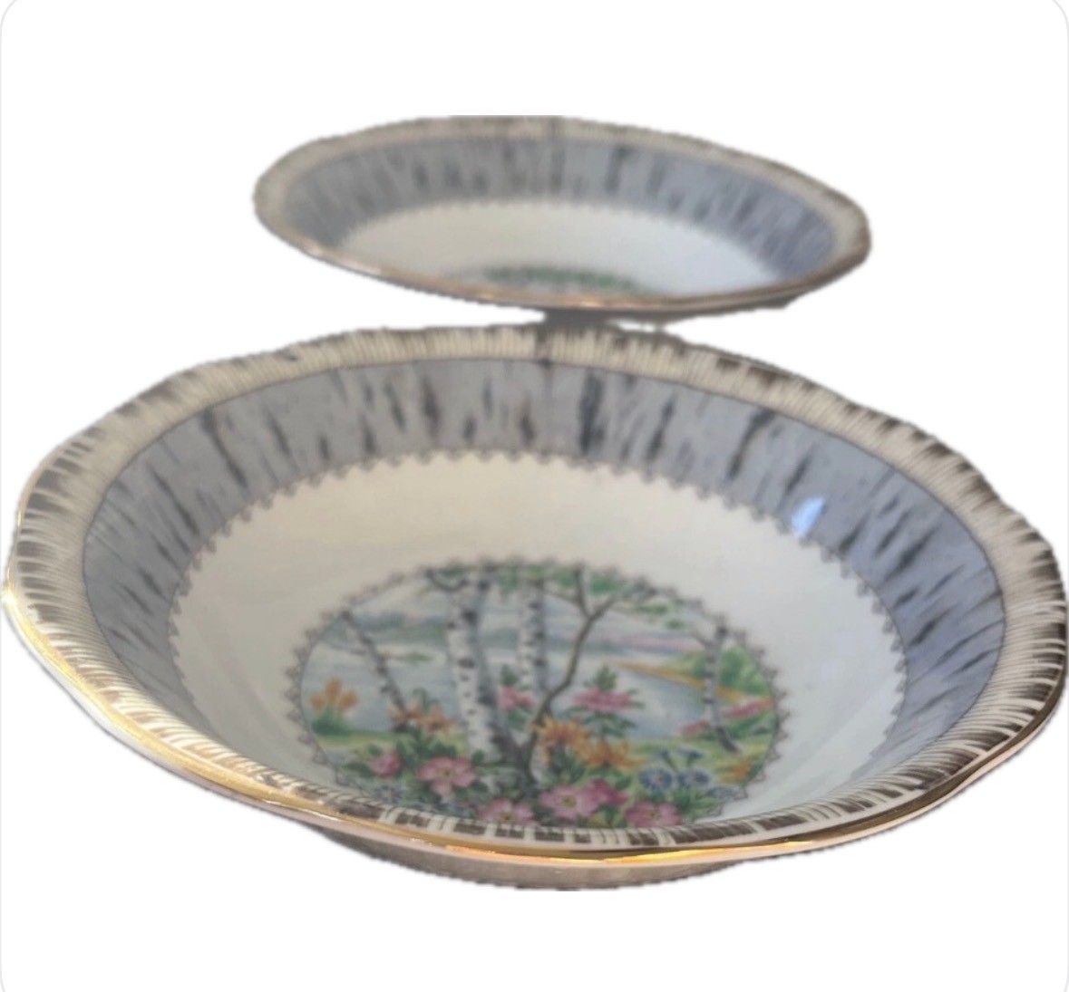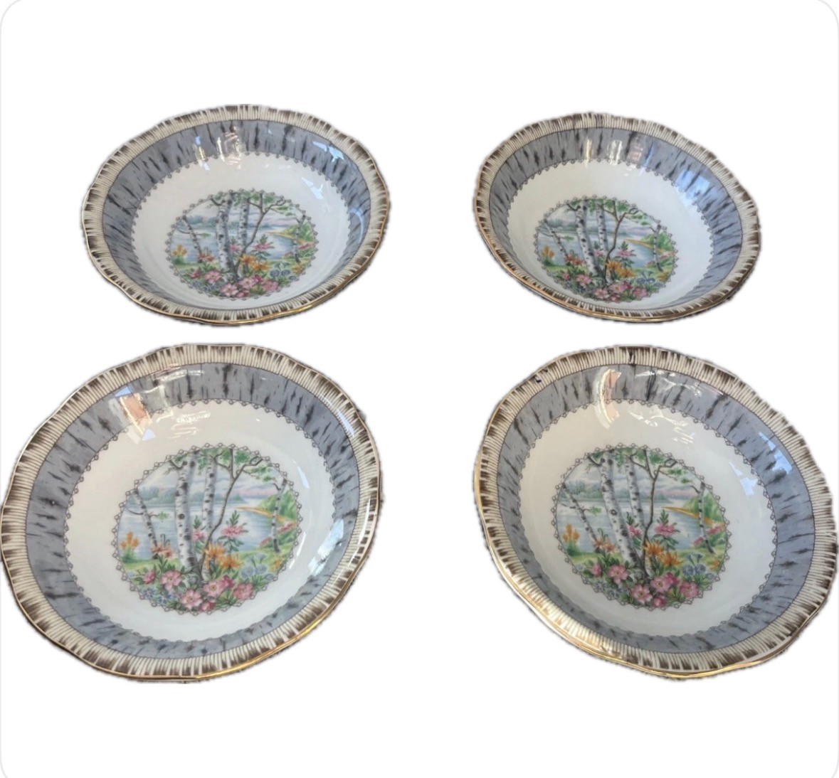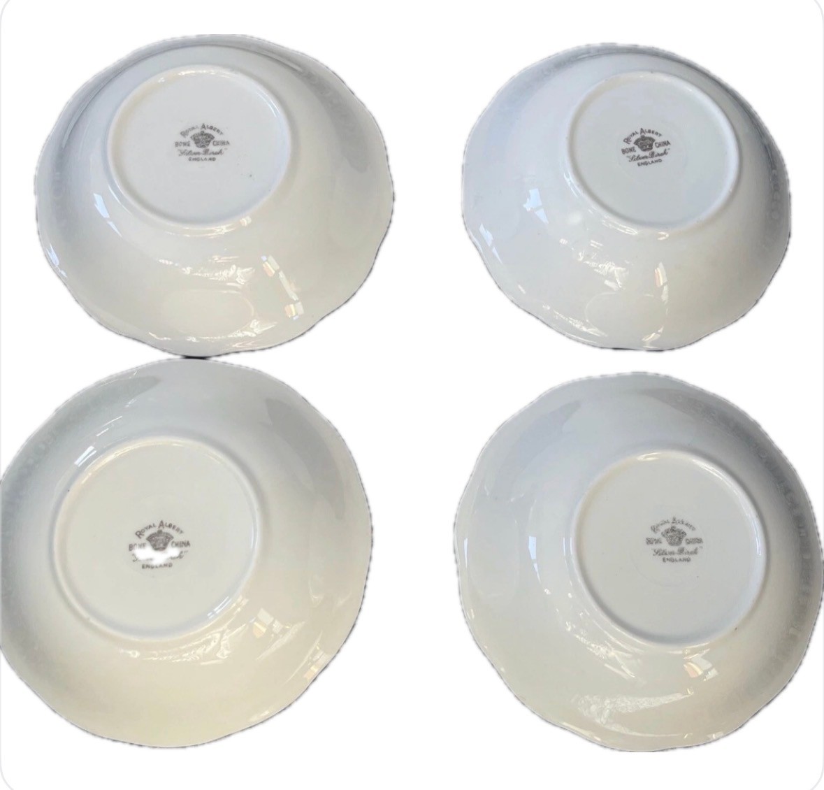 The Royal Albert Silver Birch Fruit / Dessert Bowl Set includes four 5 1/2 inch bowls made of bone china. The elegant silver color and decorative design make them perfect for serving desserts or fruits. These bowls are a beautiful addition to any dining setting. Set of 4