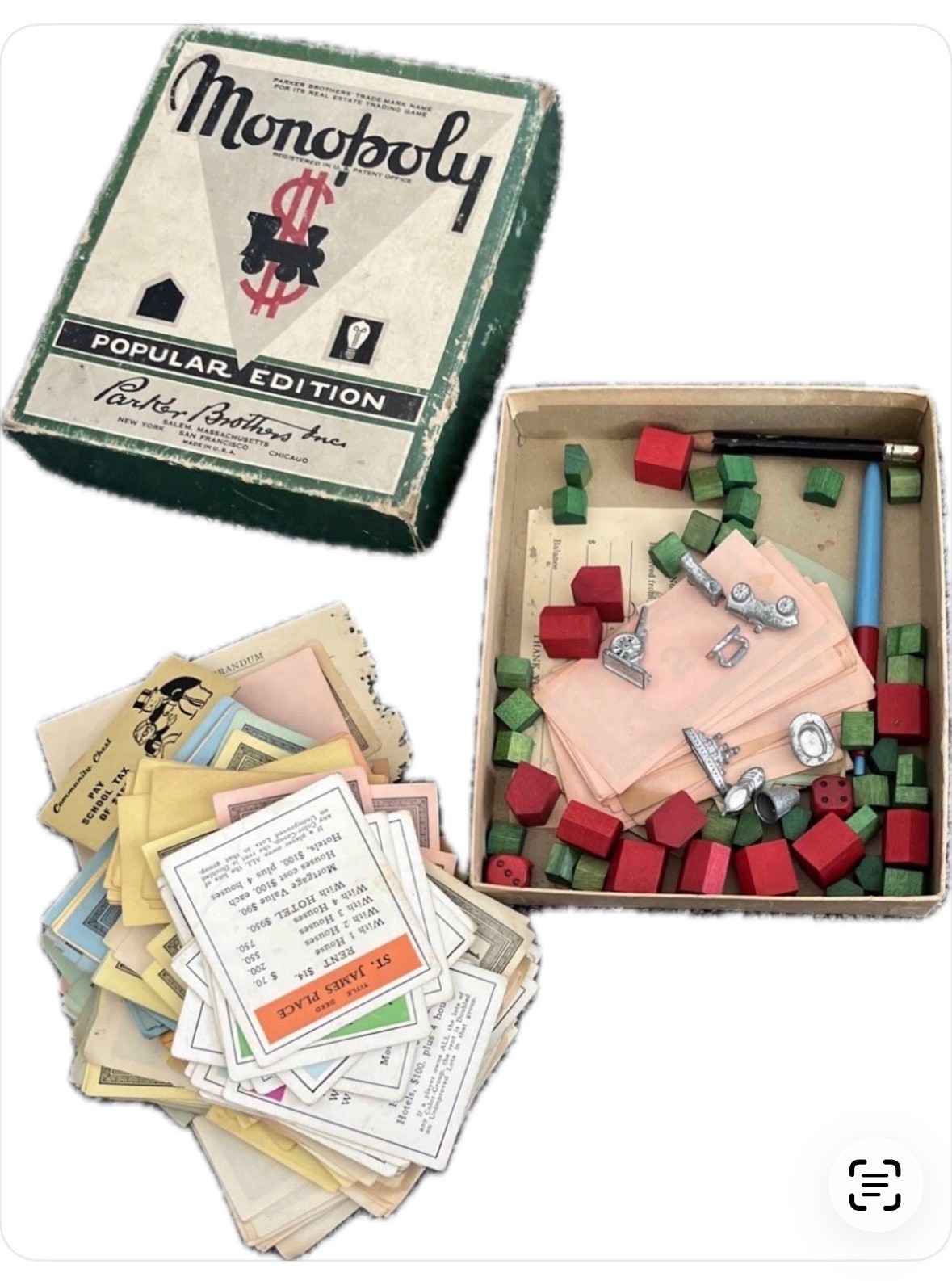 Uncover the nostalgia of classic gaming with the vintage 1954 Monopoly Popular Edition. This authentic set from Parker Brothers includes an eclectic mix of multicolor game pieces, transporting you back to the golden era of finance-themed board game entertainment. Ideal for collectors and enthusiasts, each piece reflects the rich heritage of the Monopoly character family. Crafted for those who appreciate the timeless appeal of vintage board games, this set is a testament to the enduring legacy of Parker Brothers. Please note that this listing includes only the game pieces; you'll need to provide your own board to complete your Monopoly experience. Unaware if any pieces are missing. Houses/Hotels are wood.Game pieces metal