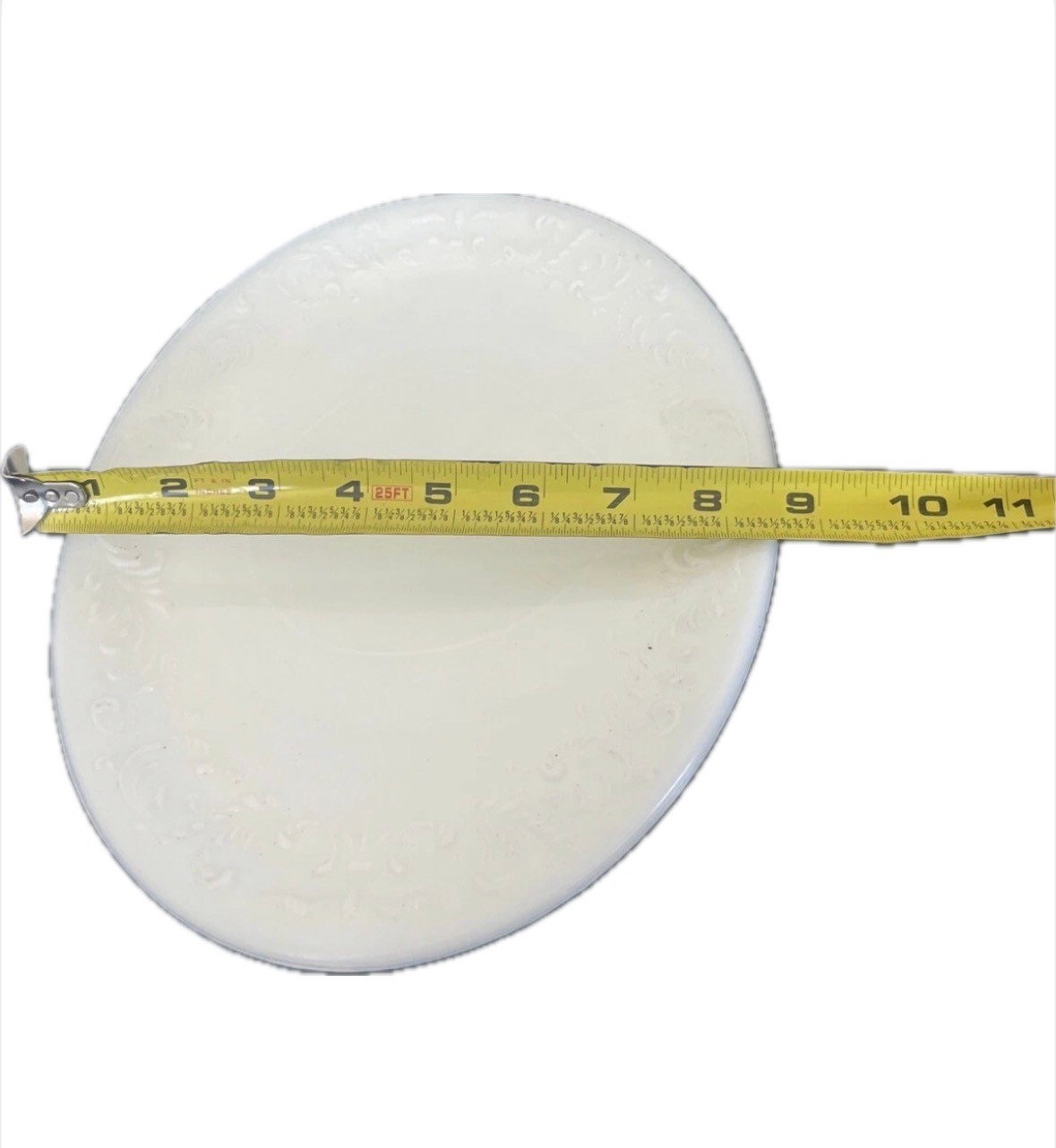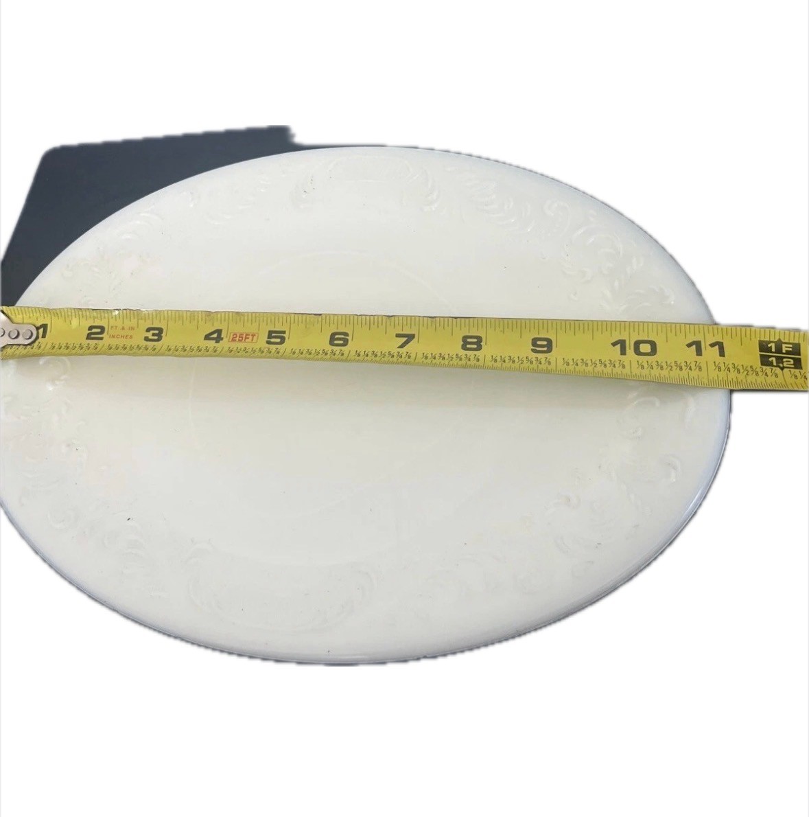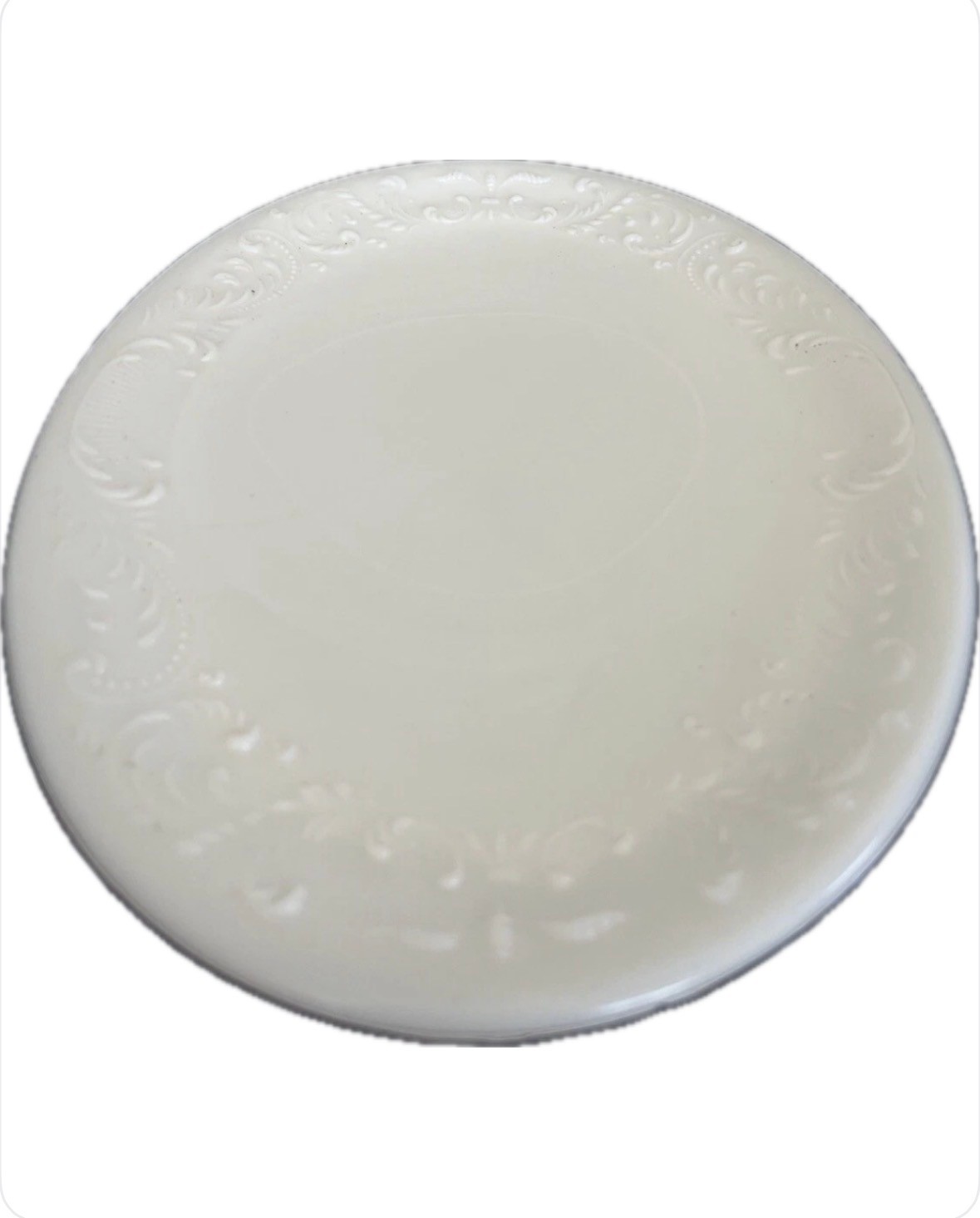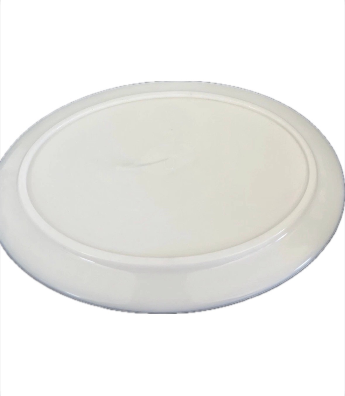 This vintage oval plate from Crown Potteries is a beautiful addition to any antique collection. The intricate raised detailing adds a unique touch to the classic white color, making it a standout piece. Crafted in the 1950s, this plate is a testament to the craftsmanship of the era and is sure to impress any collector. The plate is ready to be displayed or used as a decorative piece. Add this rare and unique piece to your collection today.