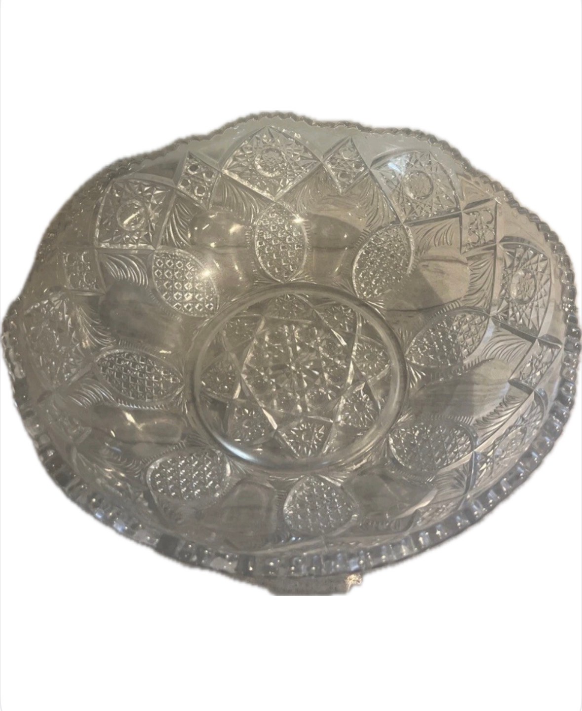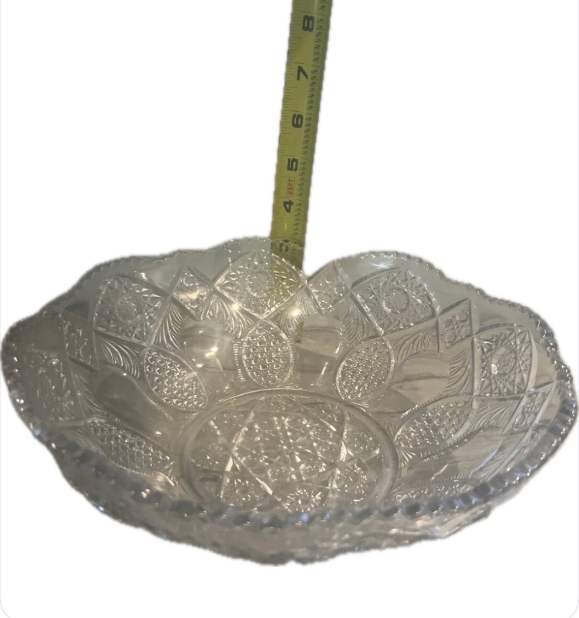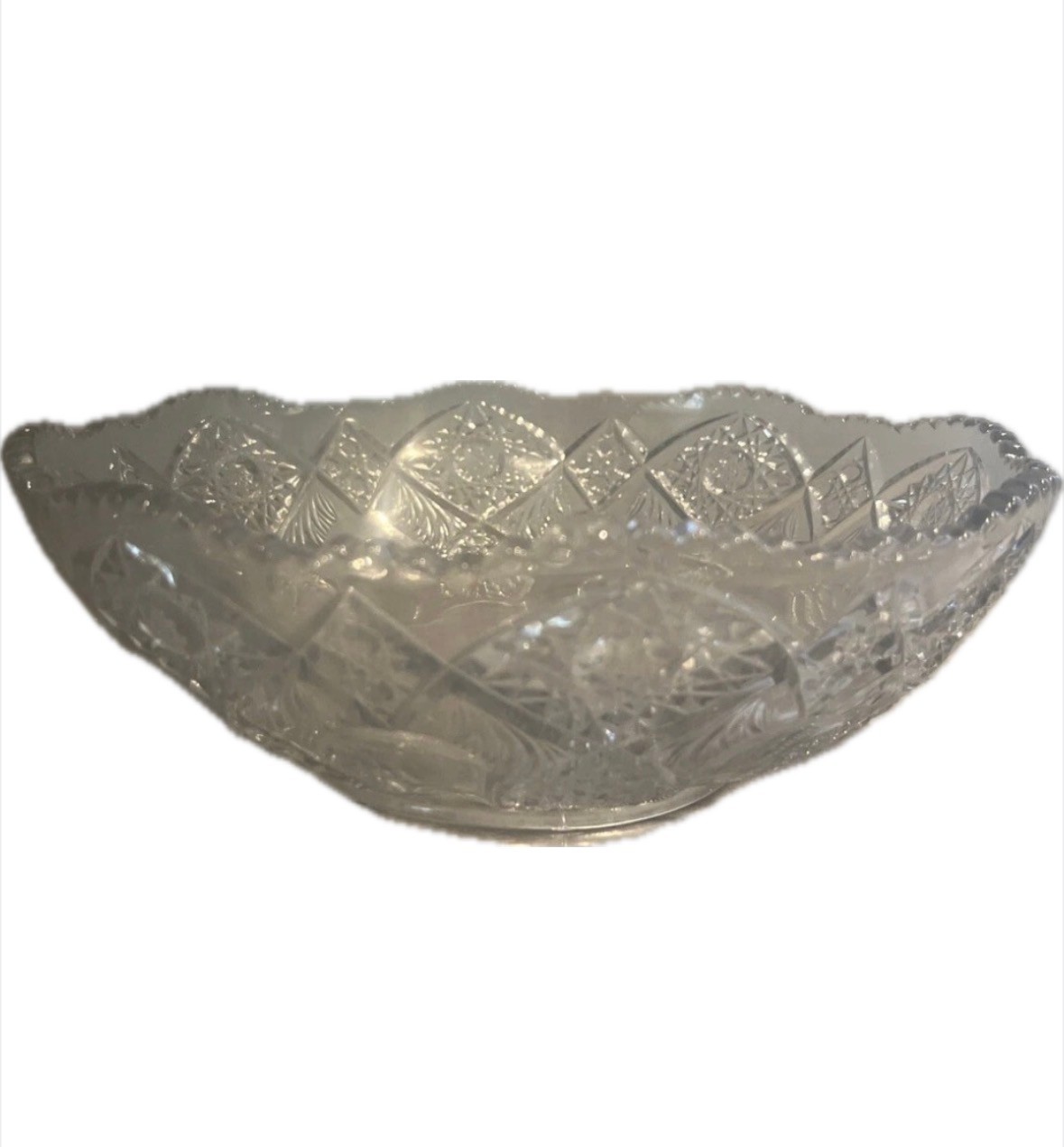 This vintage cut glass bowl is a stunning addition to any collection. Its intricate design and clear material make it suitable for all occasions. Whether you're serving a formal dinner or having a casual meal, this bowl is sure to impress your guests. Crafted with great care, this bowl is made of high-quality glass and features a beautiful vintage pattern. It is perfect for those who appreciate the art of cut glass production. The bowl is ideal for serving fruit, desserts, and other delicacies. Add this timeless piece to your collection today and enjoy its elegance for years to come.