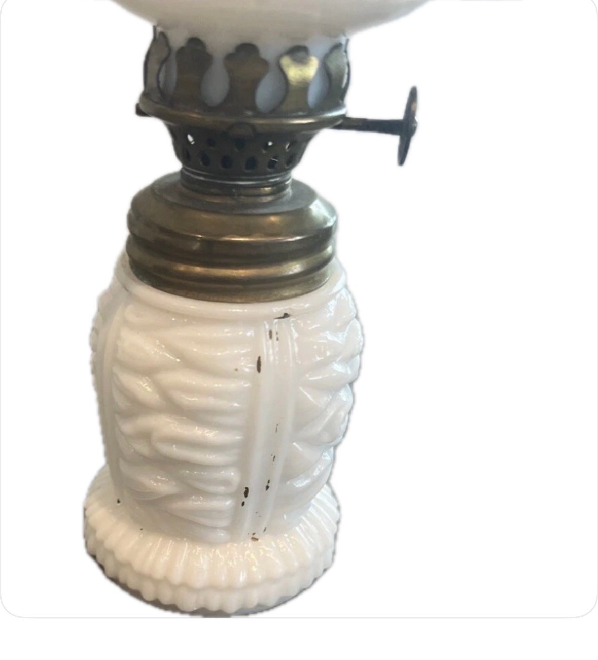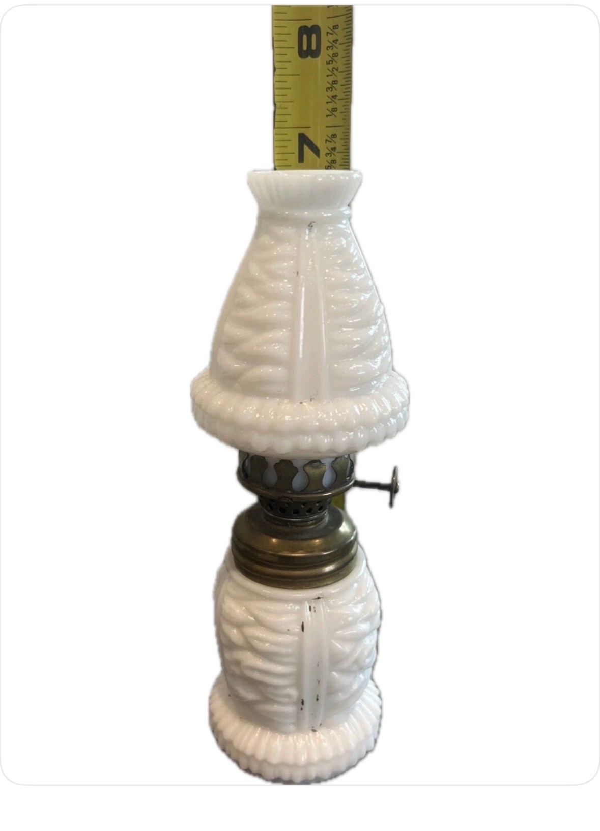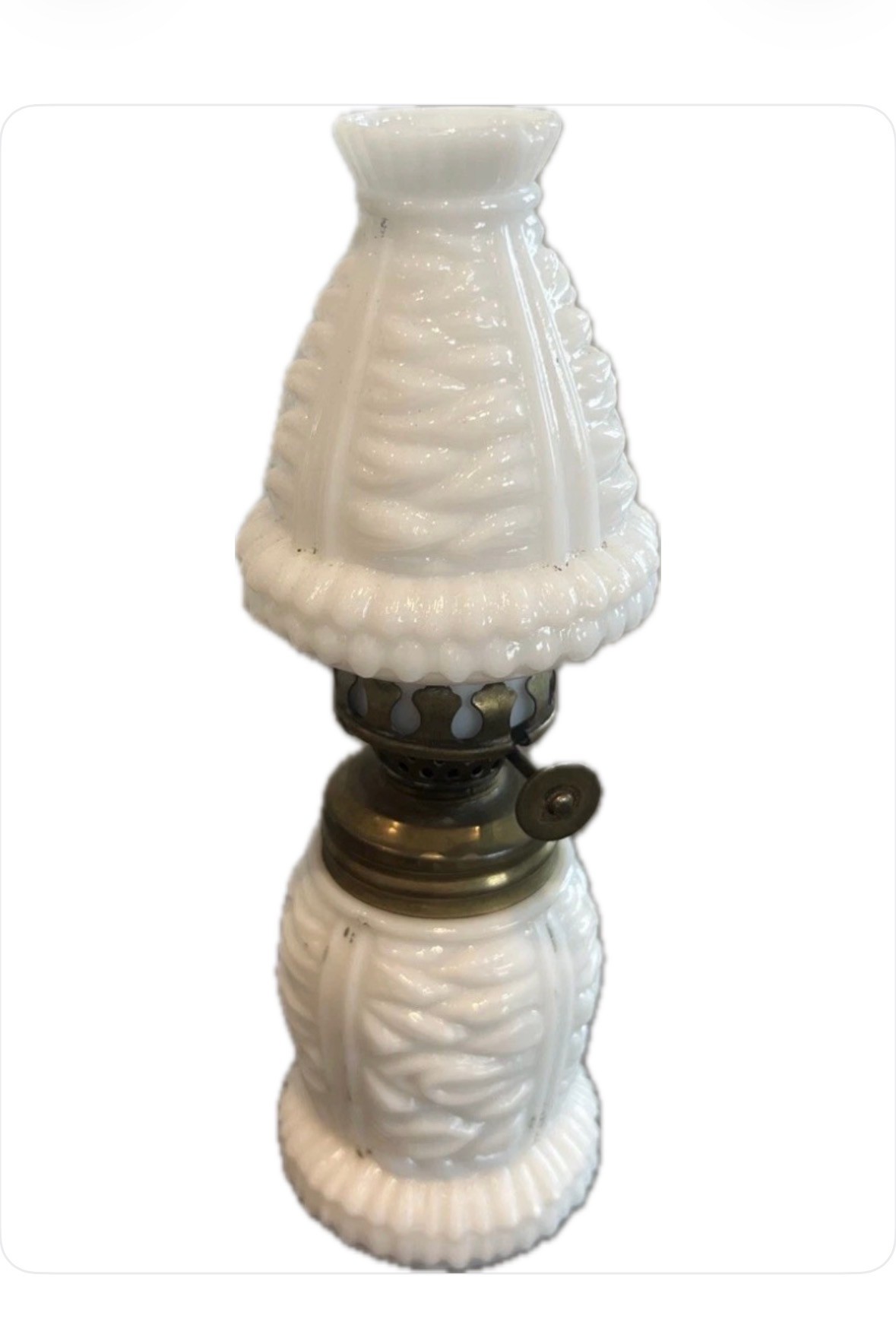 This vintage oil lamp features a beautiful "Christmas Tree" design on the milk glass shade. The lamp stands at 6.5" tall . This lamp is a perfect addition to any Victorian style collection and is an original piece. The lamp is made of glass and milk glass