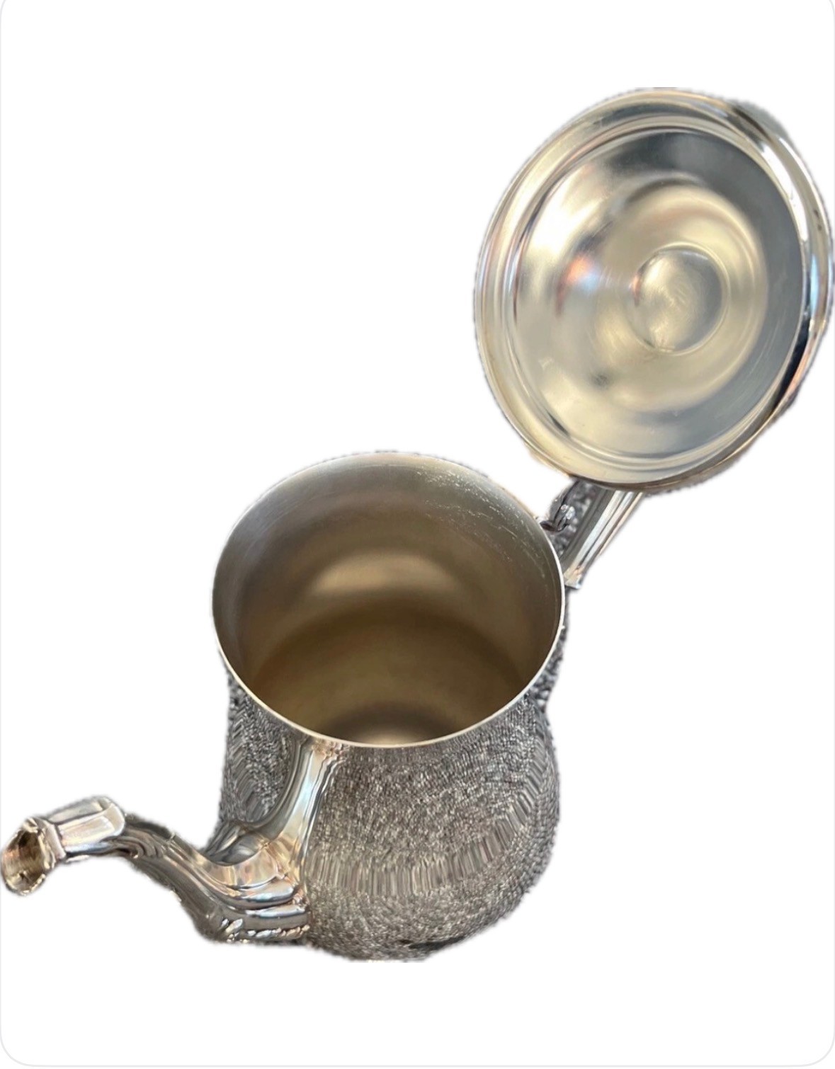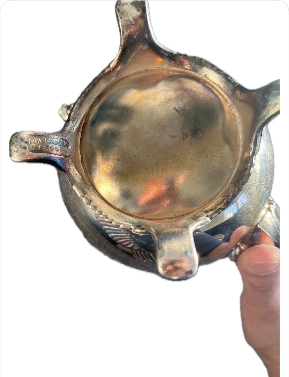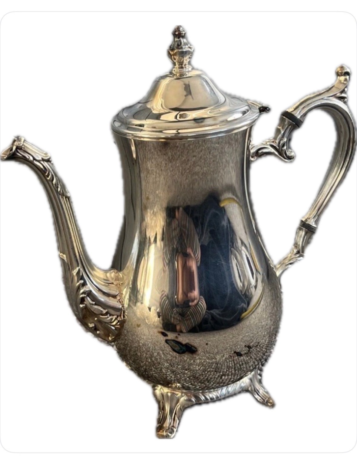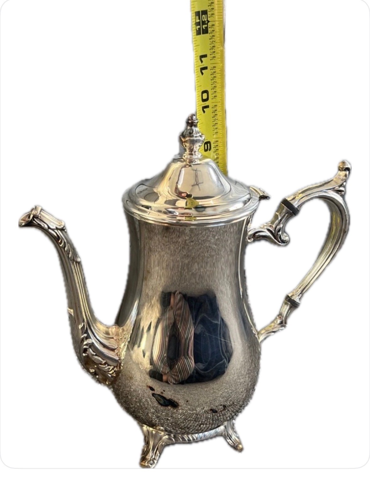 Elevate your tea service collection with the Vintage WM Rogers 800 Silverplated Footed Teapot. Crafted by the renowned Wm. Rogers & Son, this piece embodies the elegance of the Victorian era, complemented by its classic silverplate composition. A true treasure from the years 1900-1940, it stands as a testament to the timeless beauty of antique silverware. The teapot measures an impressive 10 inches and features a hinged lid, ensuring a snug fit to preserve the warmth and aroma of your favorite brew. Its distinguished style and historical value make it a standout addition to any gathering or a sophisticated display piece for enthusiasts.
