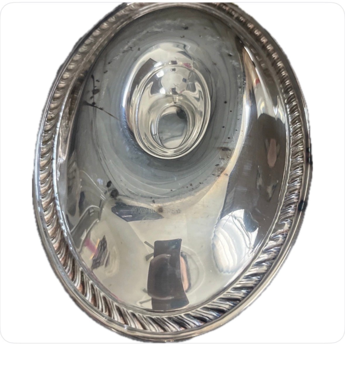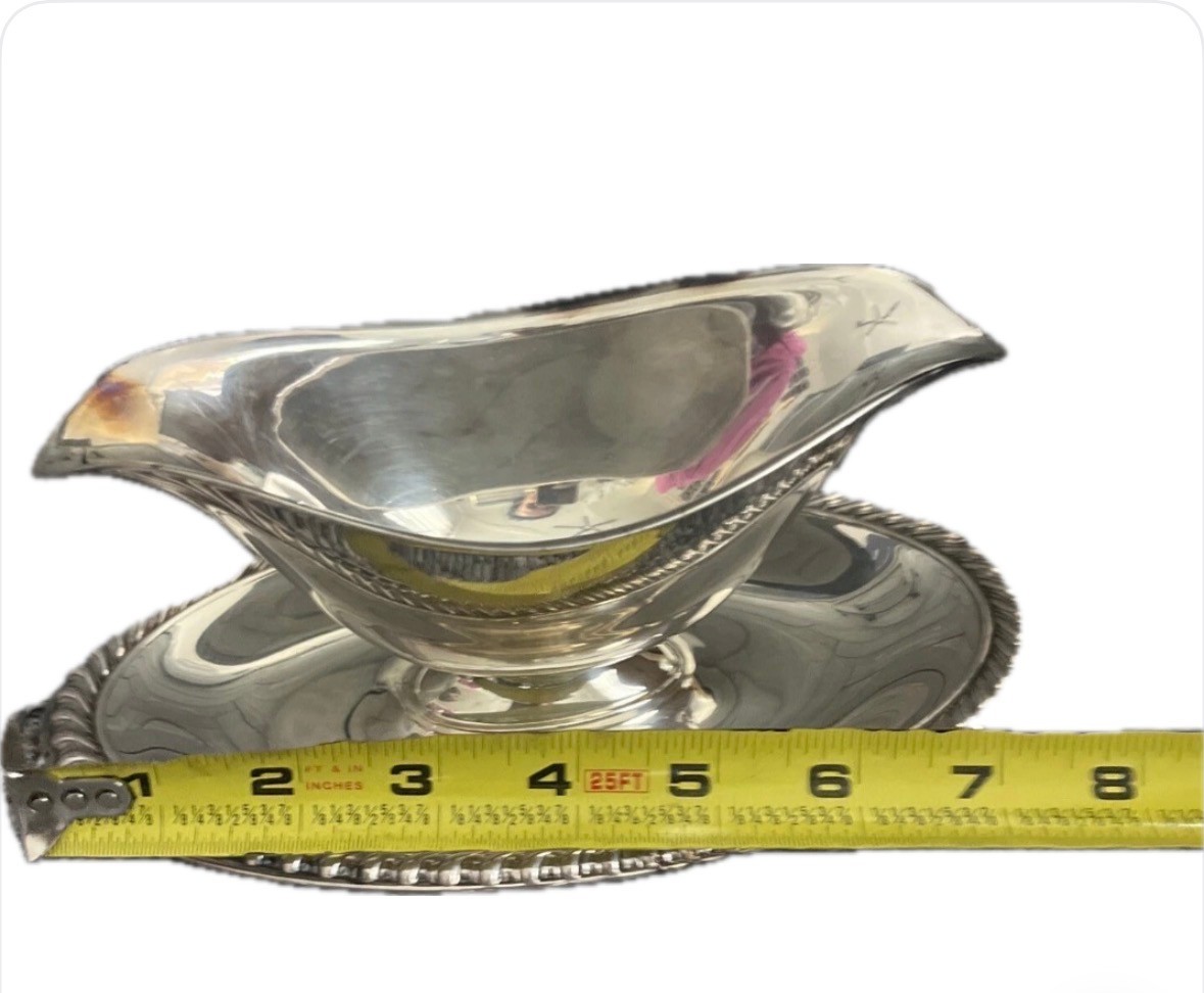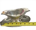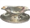 This is a Wm. Rogers & Son American Classic silverplate sauce boat with a double pour design and an attached tray. It features a traditional style and is ideal for serving gravy or sauces.