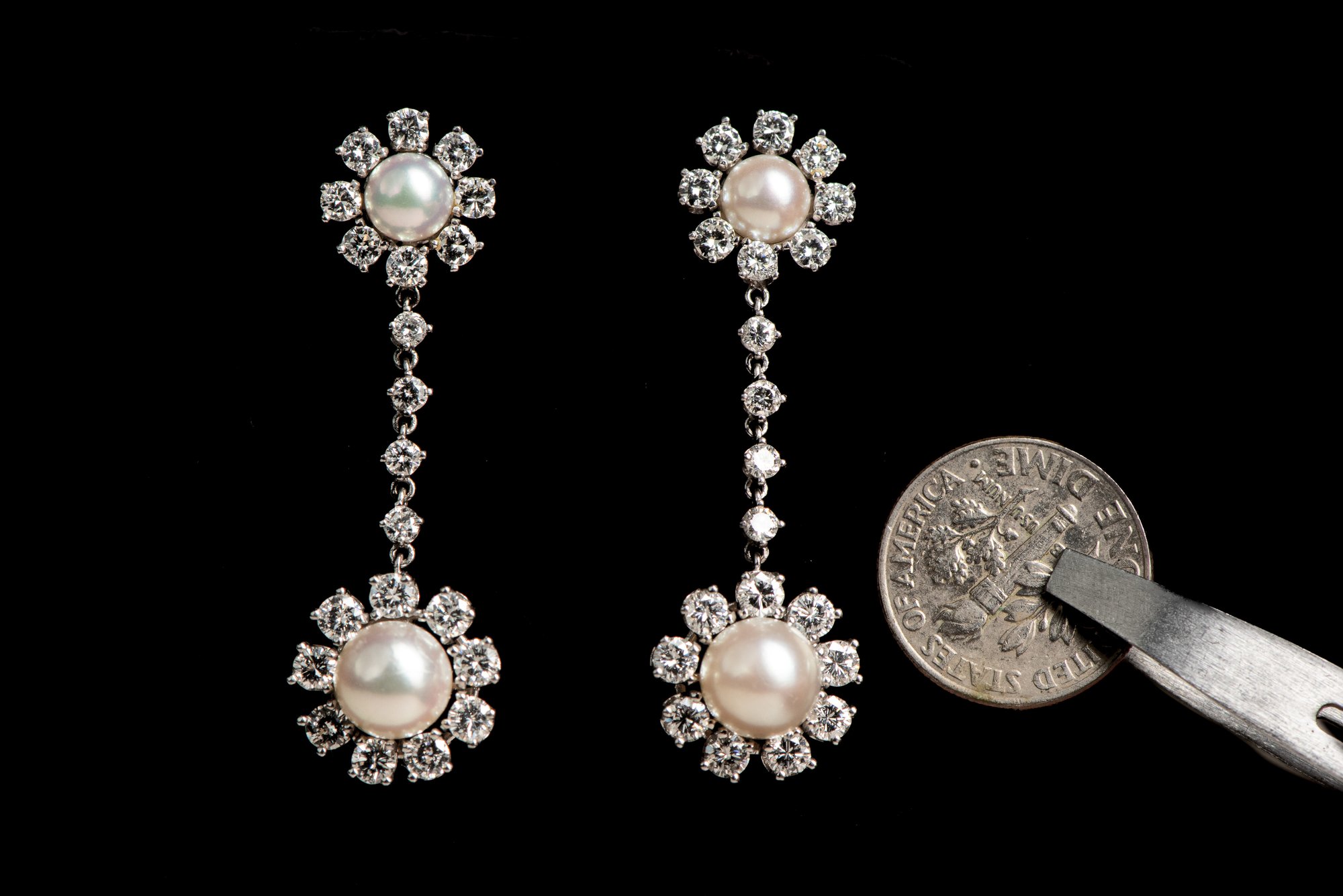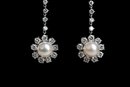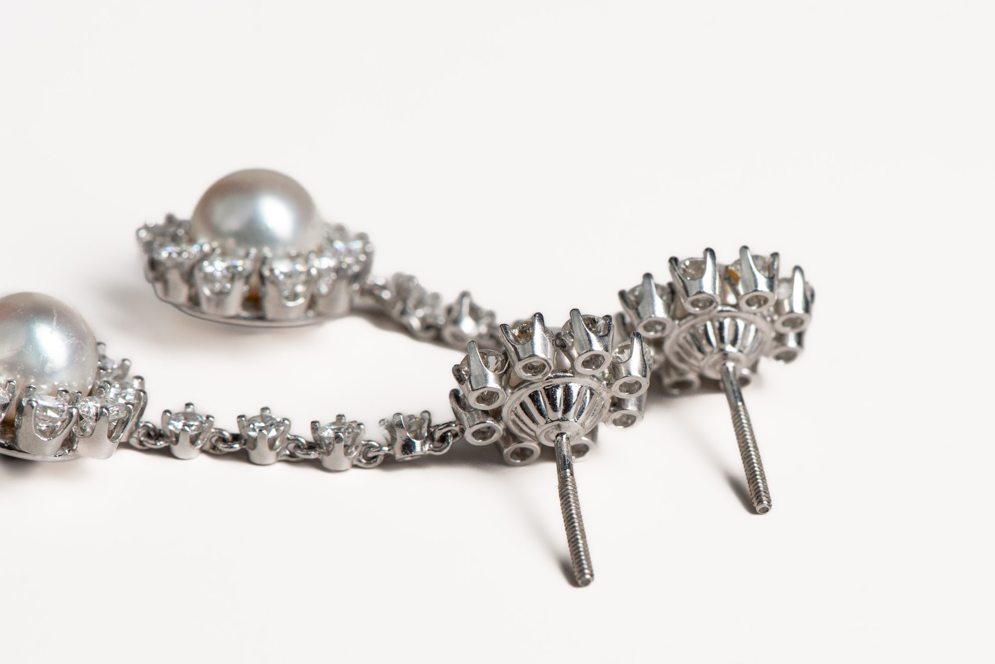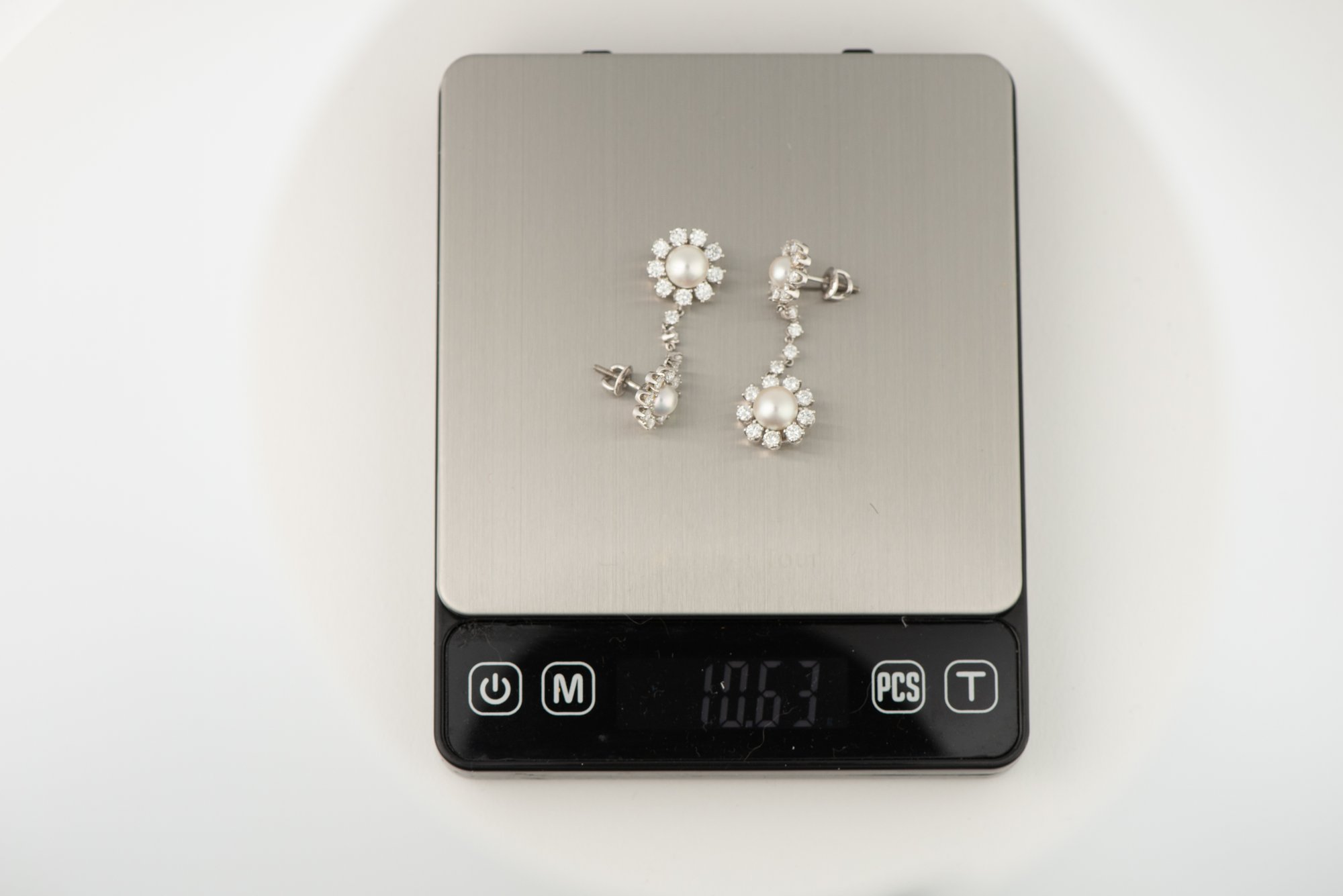 These include diamonds of 3 sizes, at the bottom each earring has 9 approximate 2.75mm round diamonds, followed by 4 2mm on the dangle chain, and 8 2.5 mm surrounding the pearl at the top for a total of 42 diamonds with approximate TCW of 2.64