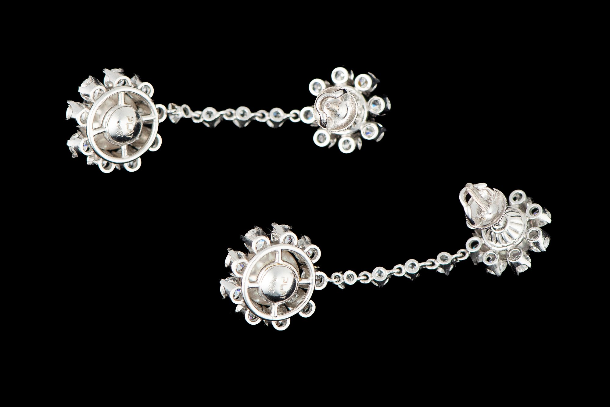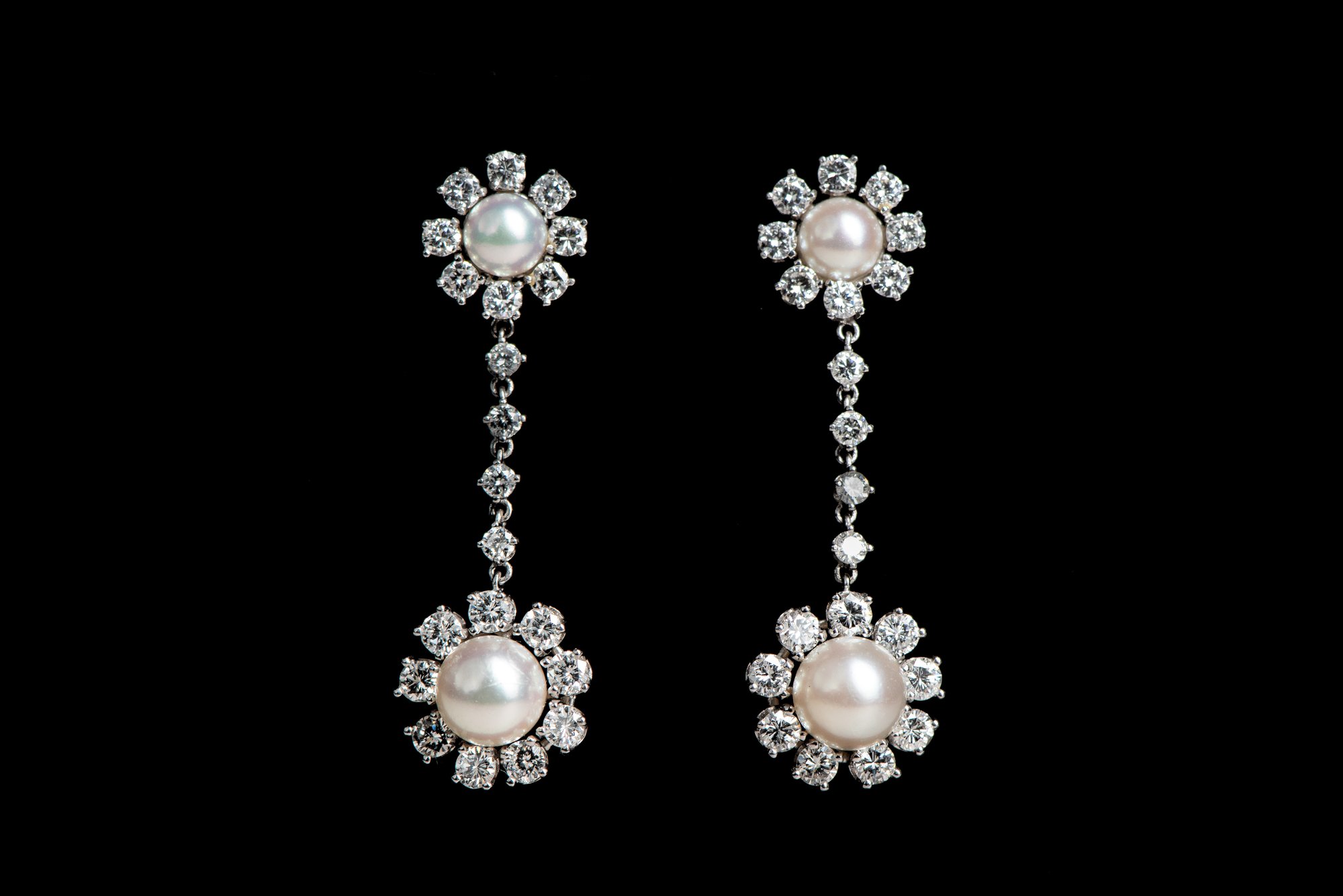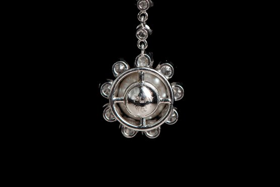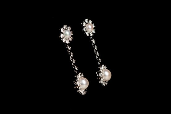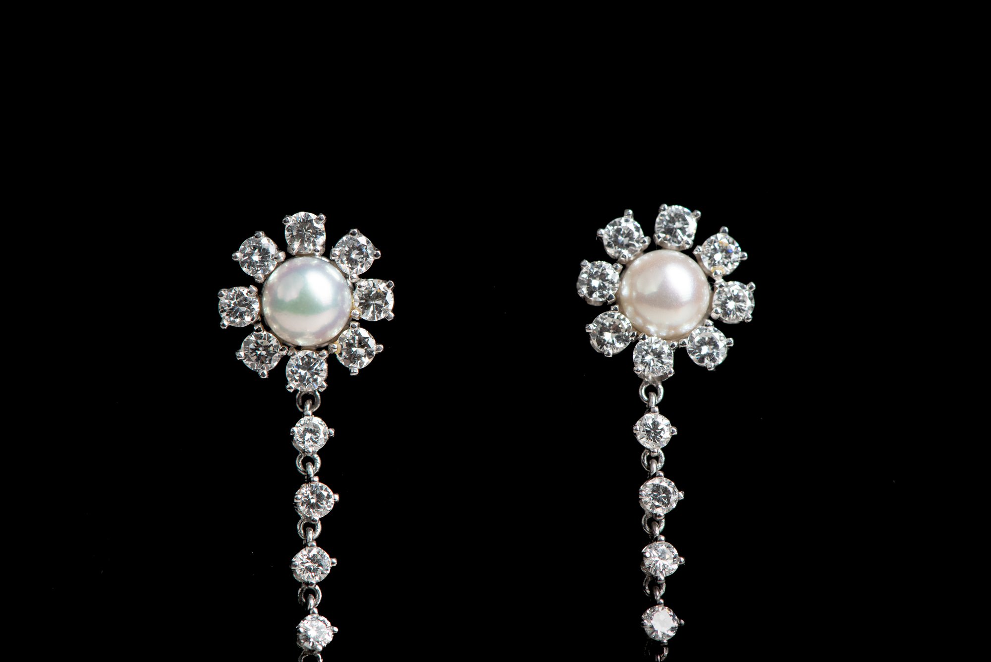 These include diamonds of 3 sizes, at the bottom each earring has 9 approximate 2.75mm round diamonds, followed by 4 2mm on the dangle chain, and 8 2.5 mm surrounding the pearl at the top for a total of 42 diamonds with approximate TCW of 2.64