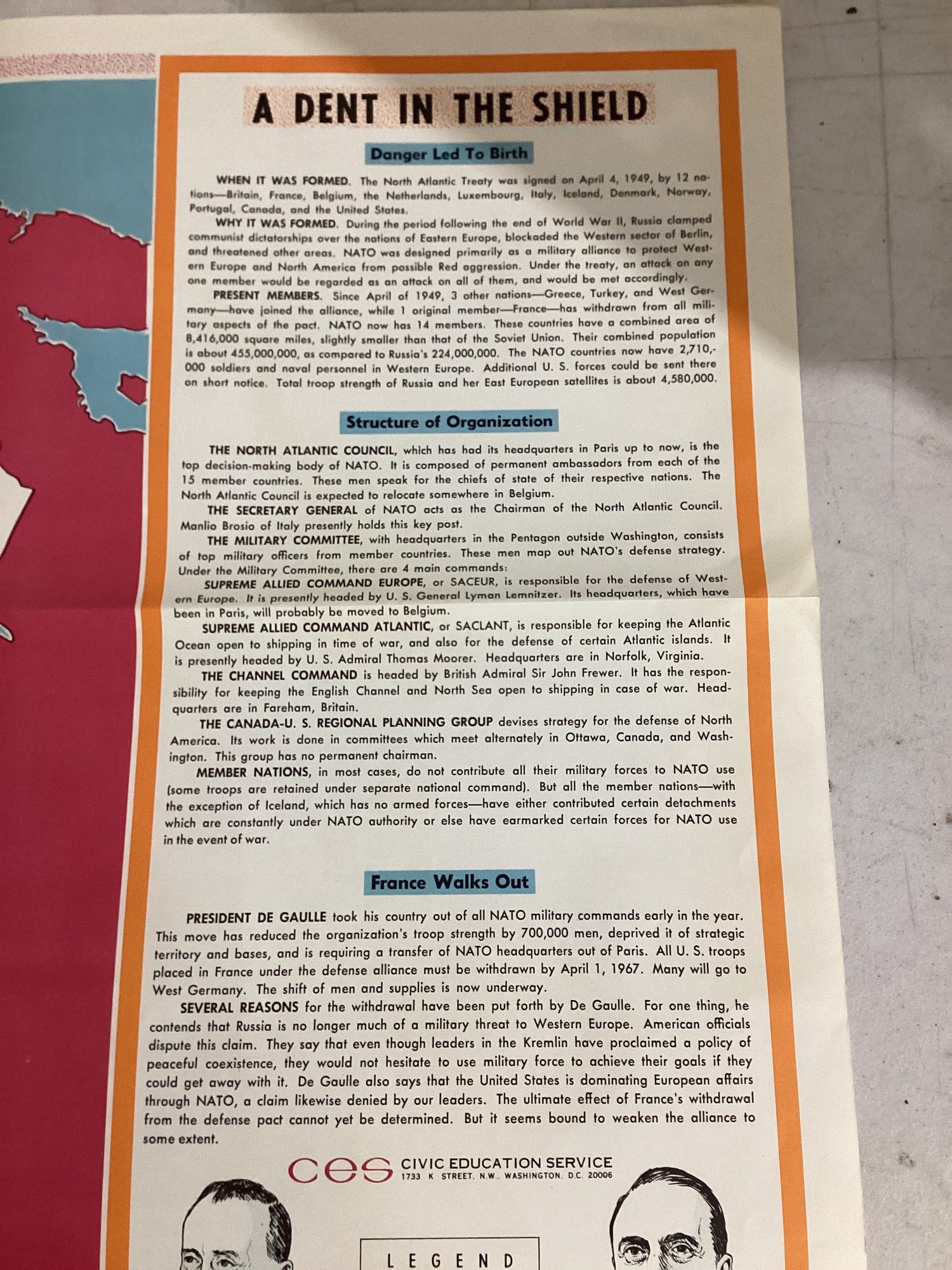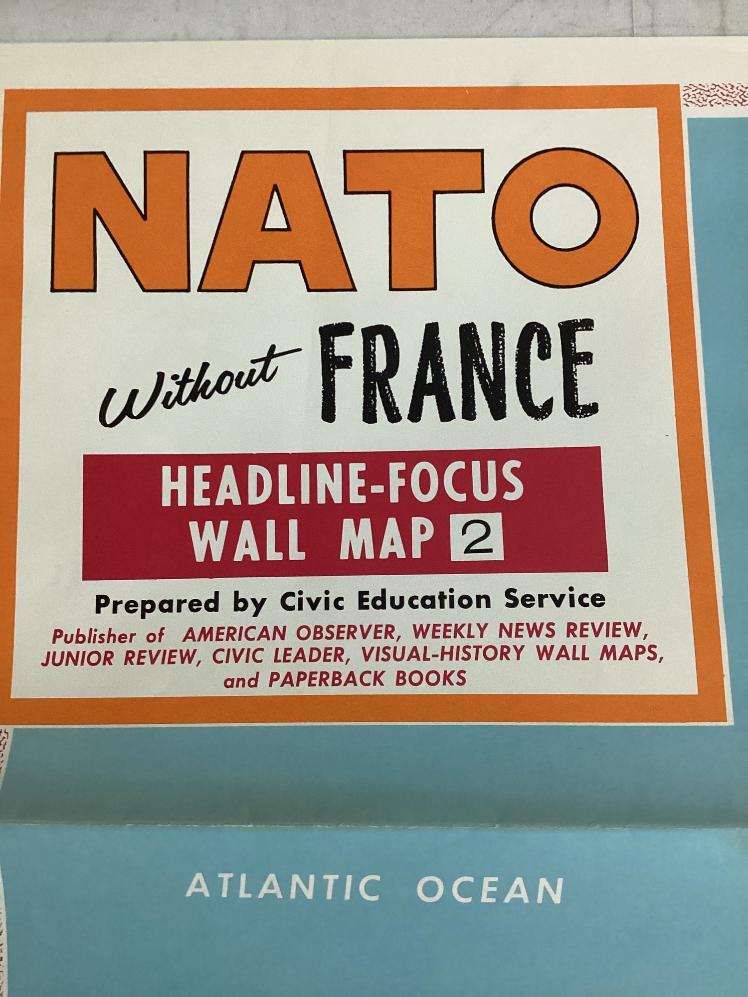 "NATO Without France" Headline-Focus Wall Map 2 Published By The Civic Education Service In 1966