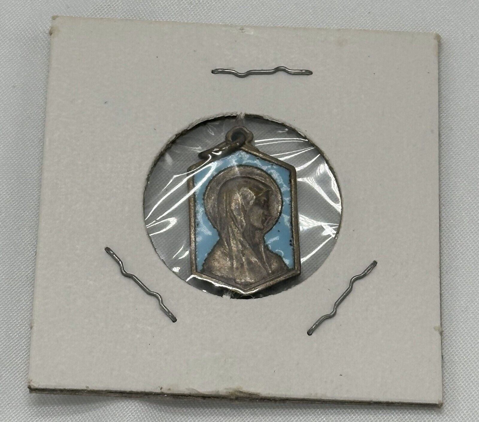 Religious French Catholic Silvered Turquoise Light Blue Enameled Medal Pendant C