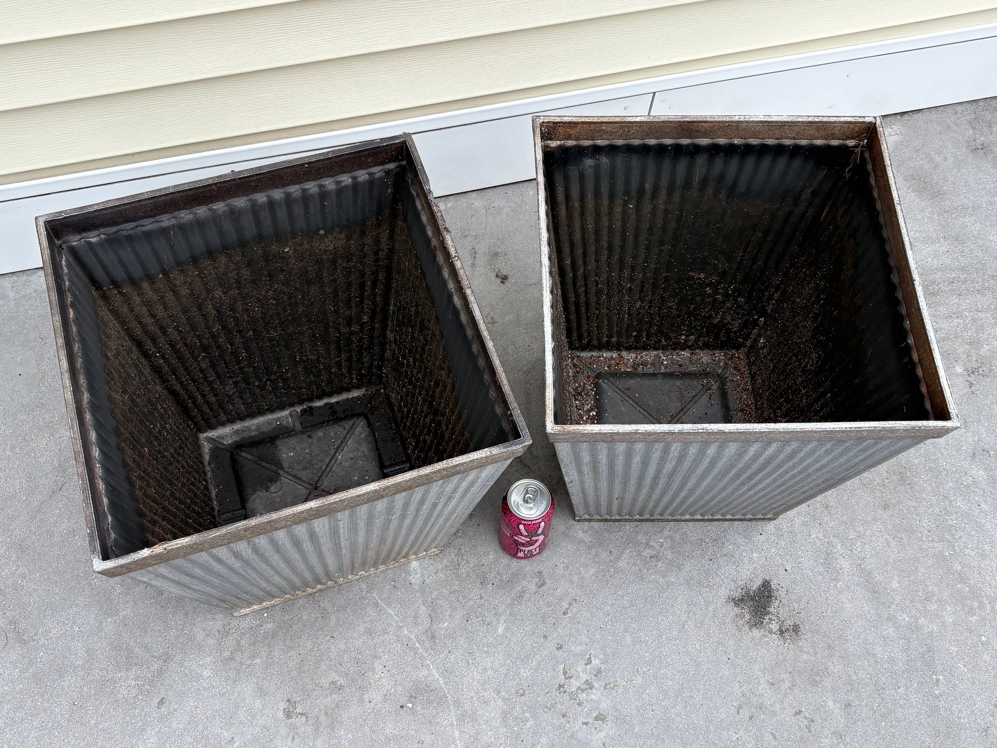 The Southern Patio Westlake Square Resin Planter features a rustic galvanized finish and grooved pattern for a farmhouse aesthetic.