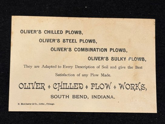 "OLIVER'S CHILLED PLOWS" Antique Victorian Trade Card - South Bend, Indiana