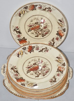 10" HANDLED CAKE PLATE & (9) 8" PLATES - BULL FINCH PATTERN = MARKED WEDGEWOOD - WEAR & IMPERFECTIONS