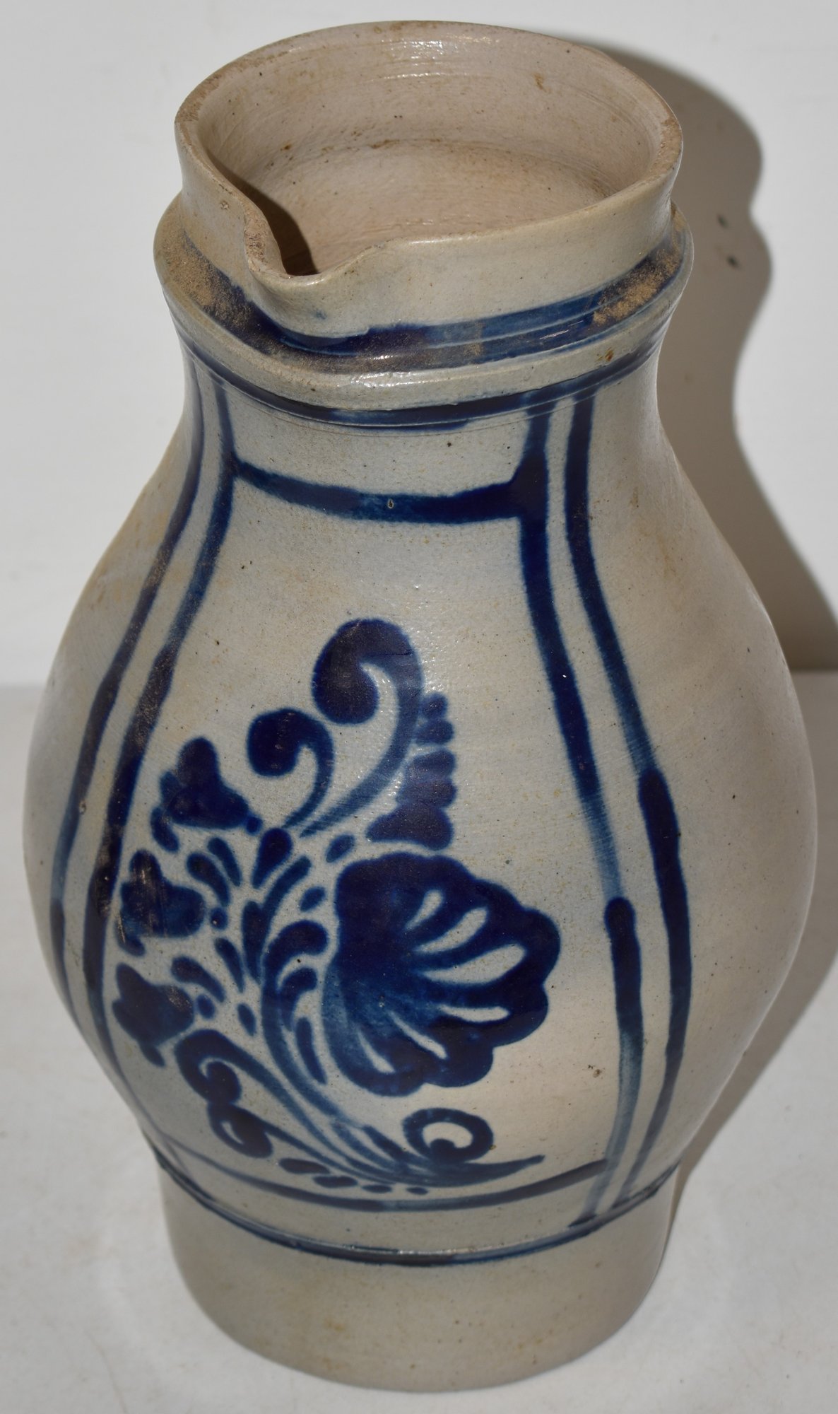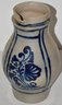 STONEWARE HANDLED PITCHER W. LARGE FLORAL COBALT DECORATION - PROB. CONTINENTAL - WEAR - HAIRLINE HANDLE