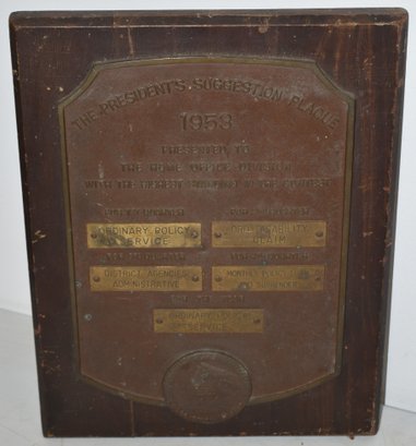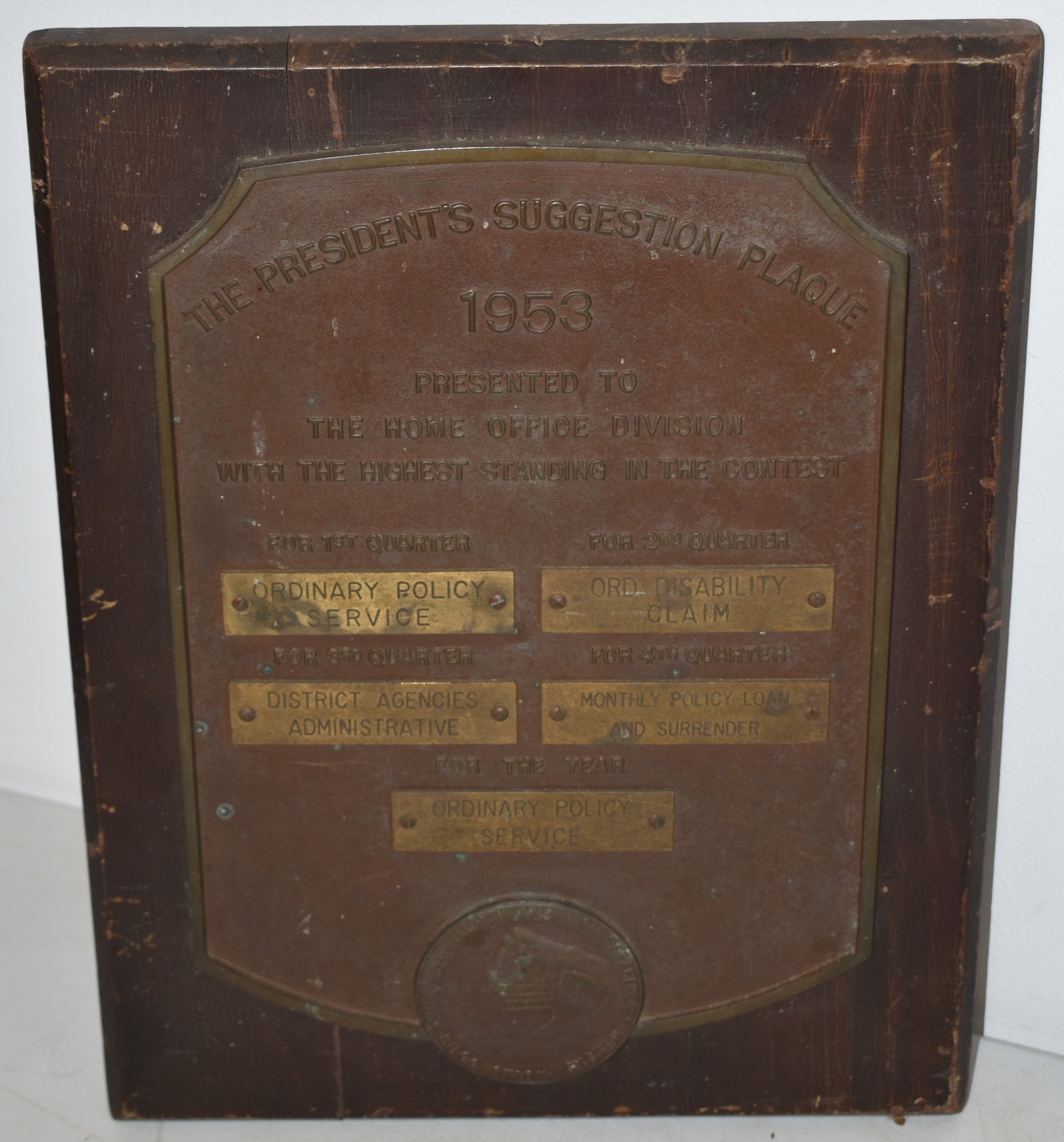BRONZE PLAQUE MOUNTED ON BOARD - THE PRESIDENTS SUGGESTION PLAQUE 1953 - OFFICE W/ THE HIGHEST STANDING IN THE CONTEST - ORDINARY POLICY SERVICE - THE PRUDENTIAL INSURANCE COMPANY - 15" 11 1/2" W/ MOUNT - WEAR