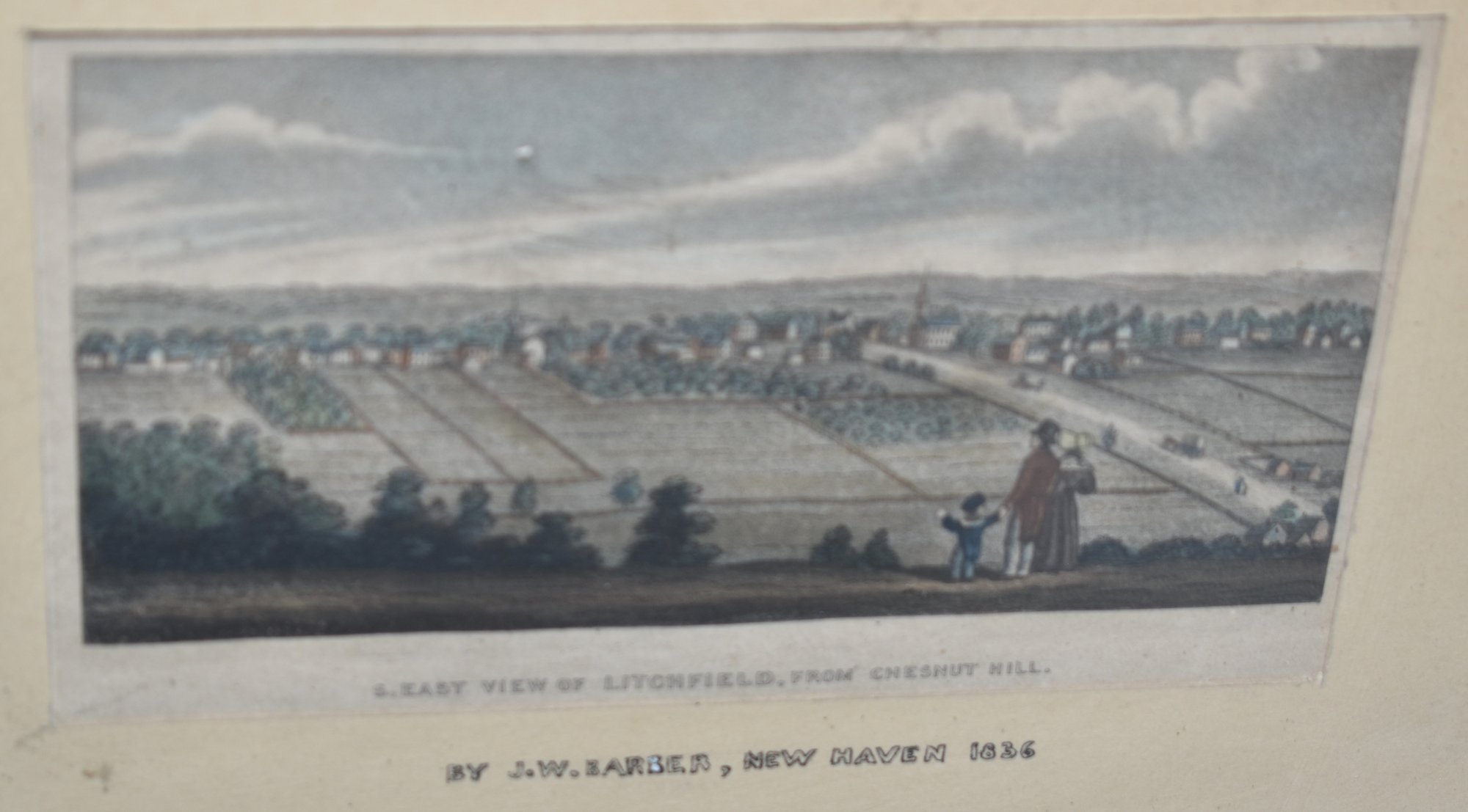 S. EAST VIEW OF LITCHFIELD FROM CHESTNUT HILL BY J.W. BARBER - NEW HAVEN 1836 - 3 3/4" X 6 1/4" SIGHT - MATTED & FRAMED - TONING & IMPERFECTIONS