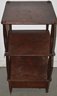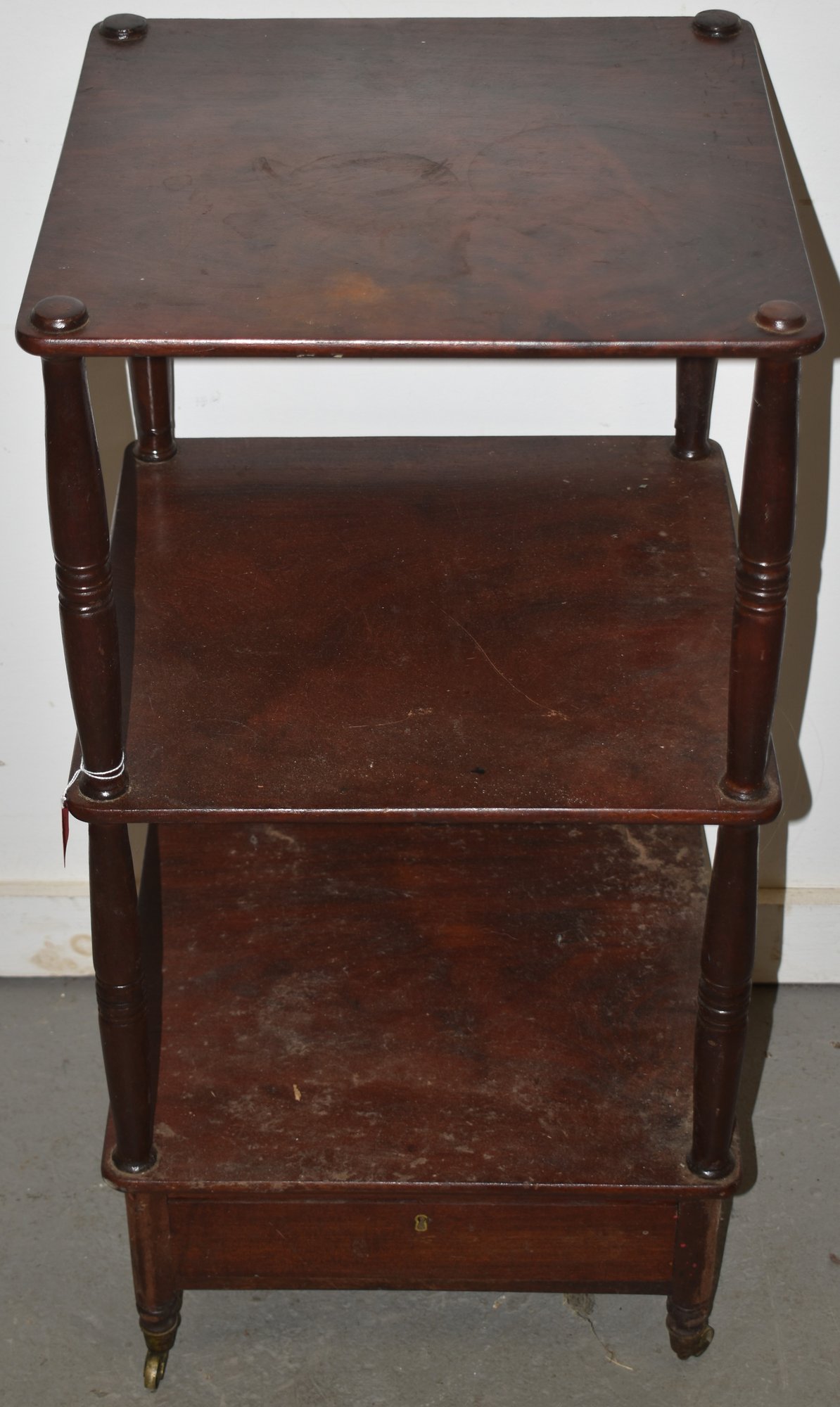 19TH CENT ENGLSIH MAHOGANY 3 TIER DUMBWAITER STAND W/ LOWER DRAWER - 33 12/2" T X 16 3/4" SQ TOP - WEAR & IMPERFECTIONS