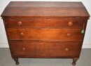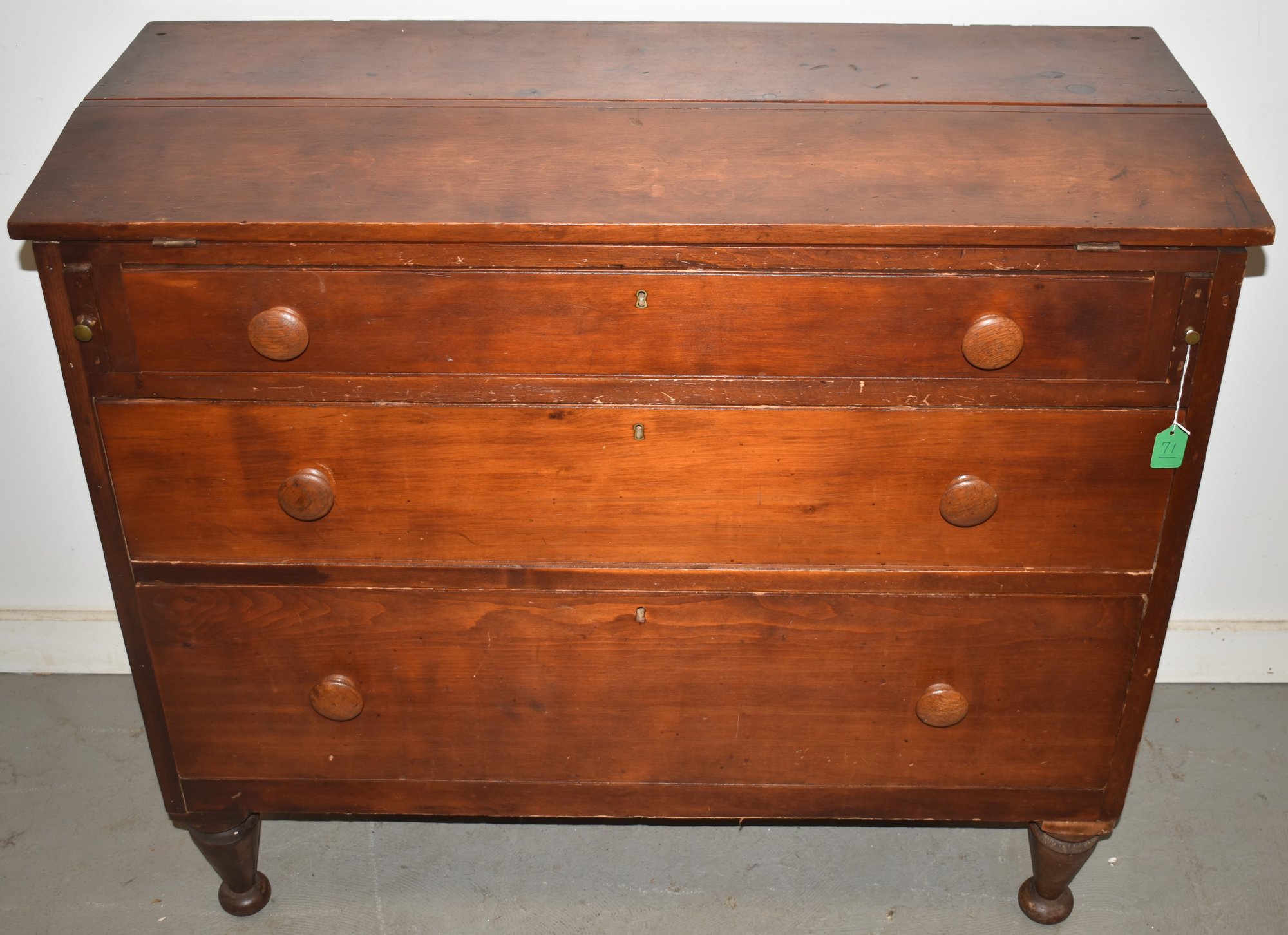 3 LONG DRAWERS WITH FLIP TOP SLANT DESK SURFACE ON TURNED LEGS - MISSING TOP CABINET - 35" T X 40 1/2" W X 17" D - WEAR & IMPERFECTIONS