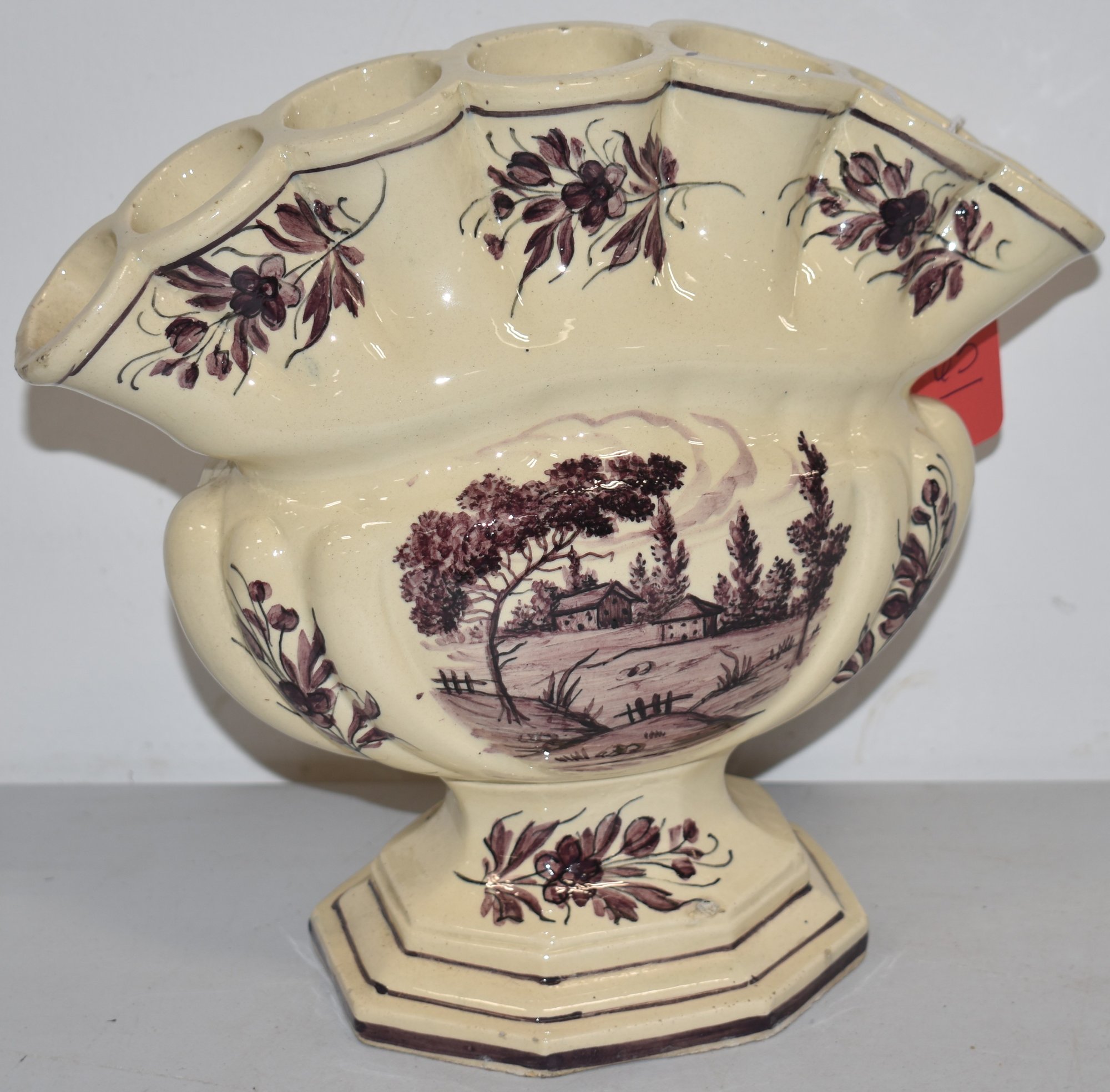 19TH CENT PURPLE TRANSFER POTTERY VASE W/ A.D. & SUNBURST MARK ON BASE - 9" T X 10" - WEAR & IMPERFECTIONS