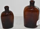 (2) AMBER SIDE STRAP FLASKS - 6" 1/2 PINT & 7 1/2" PINT - SCRATCHES & WEAR
