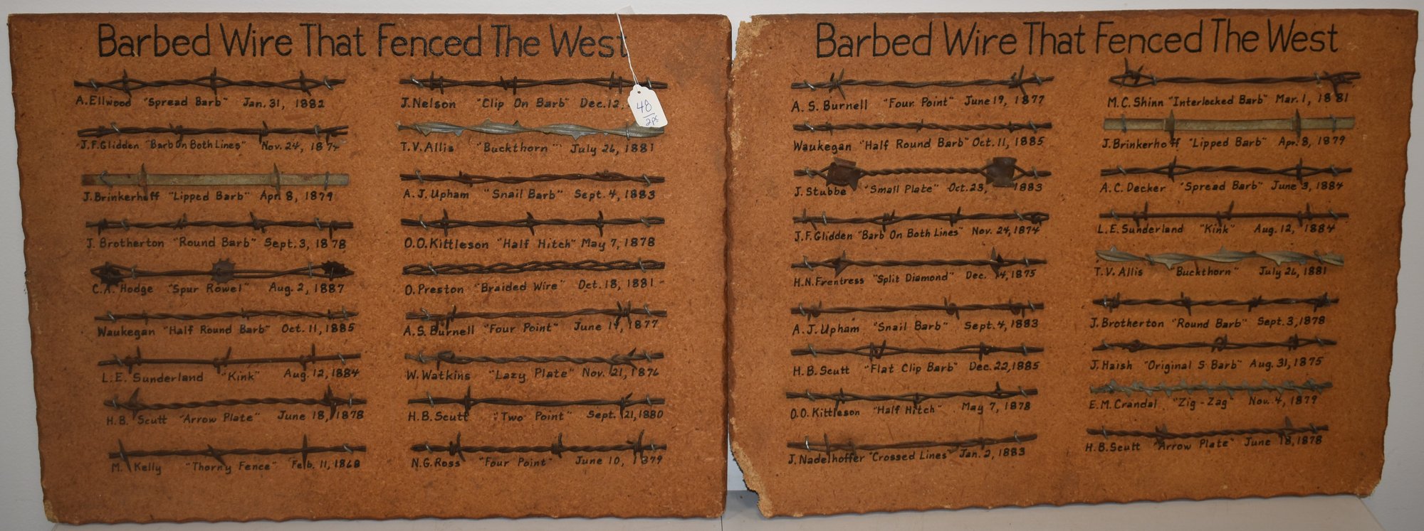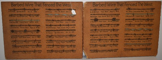 (2) VITNAGE 20TH CENT BARBED WIRE DISPALY BOARDS - BARBED WIRE THAT FENCED THE WEST - 24" X 18" - WEAR, LOSSES TO BACK BOARDS & IMPERFECTIONS