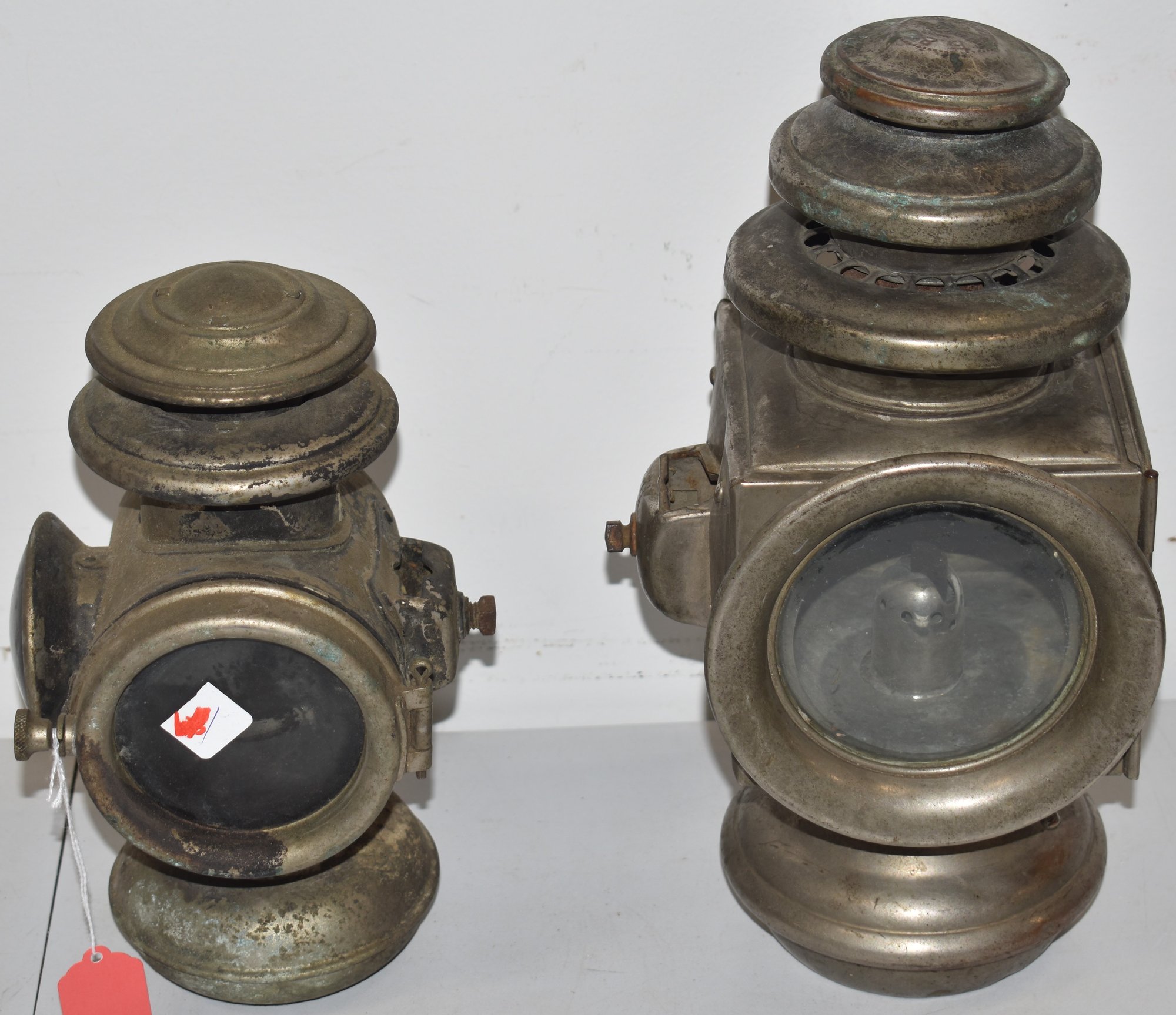(1) 13" E. 8. J. 1909 DETRIOT & (1) 10 1/4" 1909 SOLAR W/ SIDE RED LENSE - DENTS, OXIDATION & WEAR