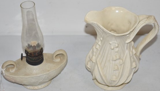 6" PITCHER & 5 1/2" ALLADIN STYLE OIL LAMP - WEAR & IMPERFECTIONS