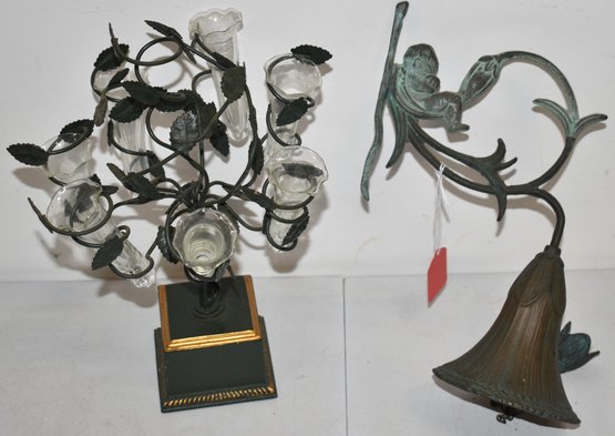 11 3/4" BUD VASE TREE W/ GLASS INSERTS & BRONZED METAL DOOR BELL 11 1/2" X 4" DIA - WEAR & IMPERFECTIONS
