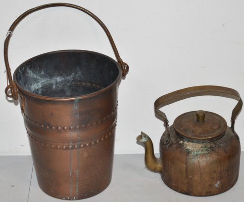 COPPER TEA POT & COPPER PAIL W/ BAIL HANDLE (9"T) - WEAR & IMPERFECTIONS
