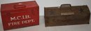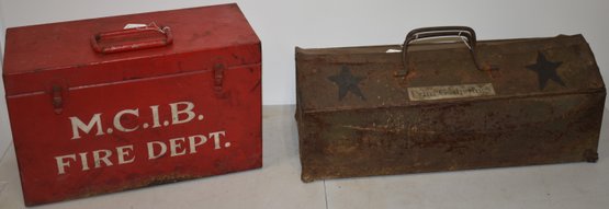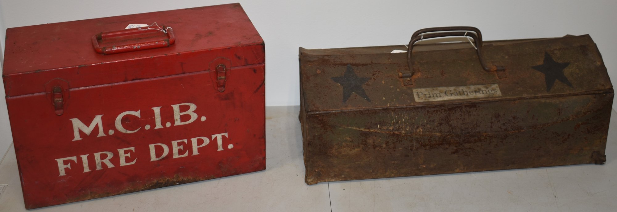 (1) RED W/ WHITE LETTERING M.C.I.B. FIRE DEPT W/ DIVIDED INTERIOR 16" L X 7" W X 10" T WEAR & RUST TOGETHER W/ 21" TOOL BOX W/ DOUBLE SLANT TOP LID - 21" L X 8 3/4" W X 7 3/4" T - BLUE STARS & LABEL - PRIM GATHERINGS - WEAR, DENTS & RUST