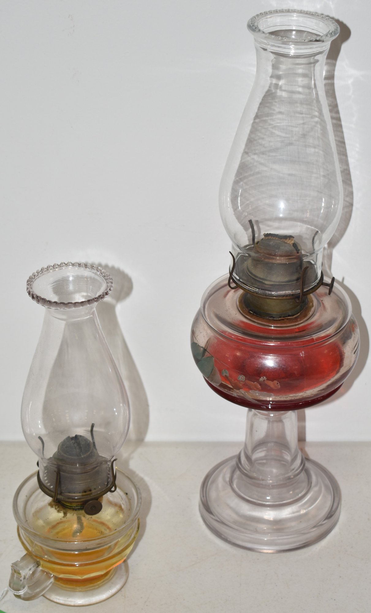 (1) FINGER LAMP 11 1/2" W/ CHIMNEY & (1) TABLE - 18 1/2" T W/ CHIMNEY - WEAR
