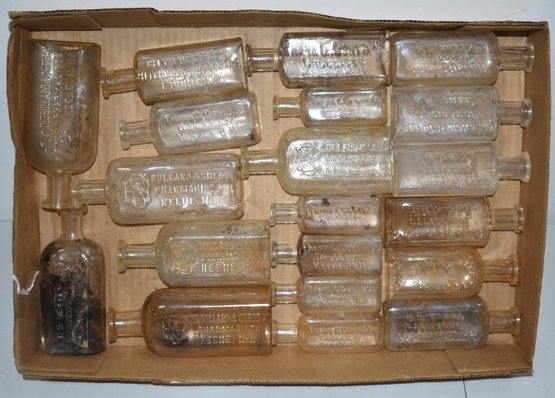 (20) CLEAR EMBOSSED BOTTLES - KEENE NH BUSINESS - FRANK C. DORT DRUGGISTS, DR. LESURES KEENE, BULLARD & SHED PHARMICISTS, CITY PHARMACISTS - WEAR, CHIPS, MINOR CONENT STAINS & IMPERFECTIONS