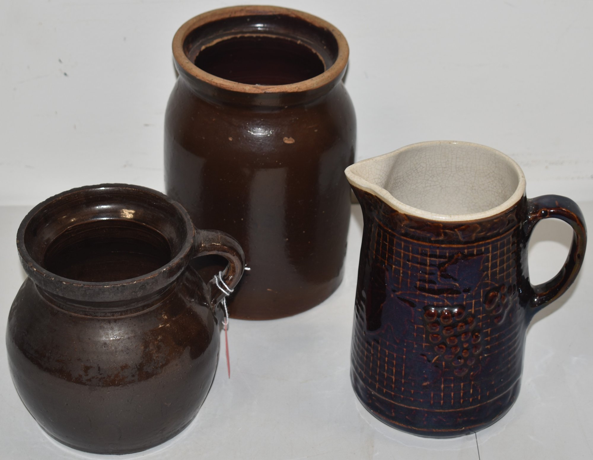 SM. 6" BEAN POT, 8" STORAGE JAR & 7 1/4" BASKET WEAVE PITCHER W/ GRAPES - WEAR