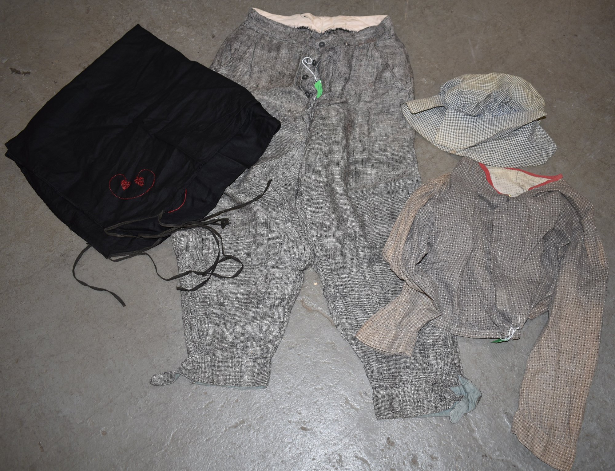 WOOL PANTS, BONNET & LINEN BLOUSE TOGETHER W/ BLACK TABLE COVERING - WEAR & IMPERFECTIONS