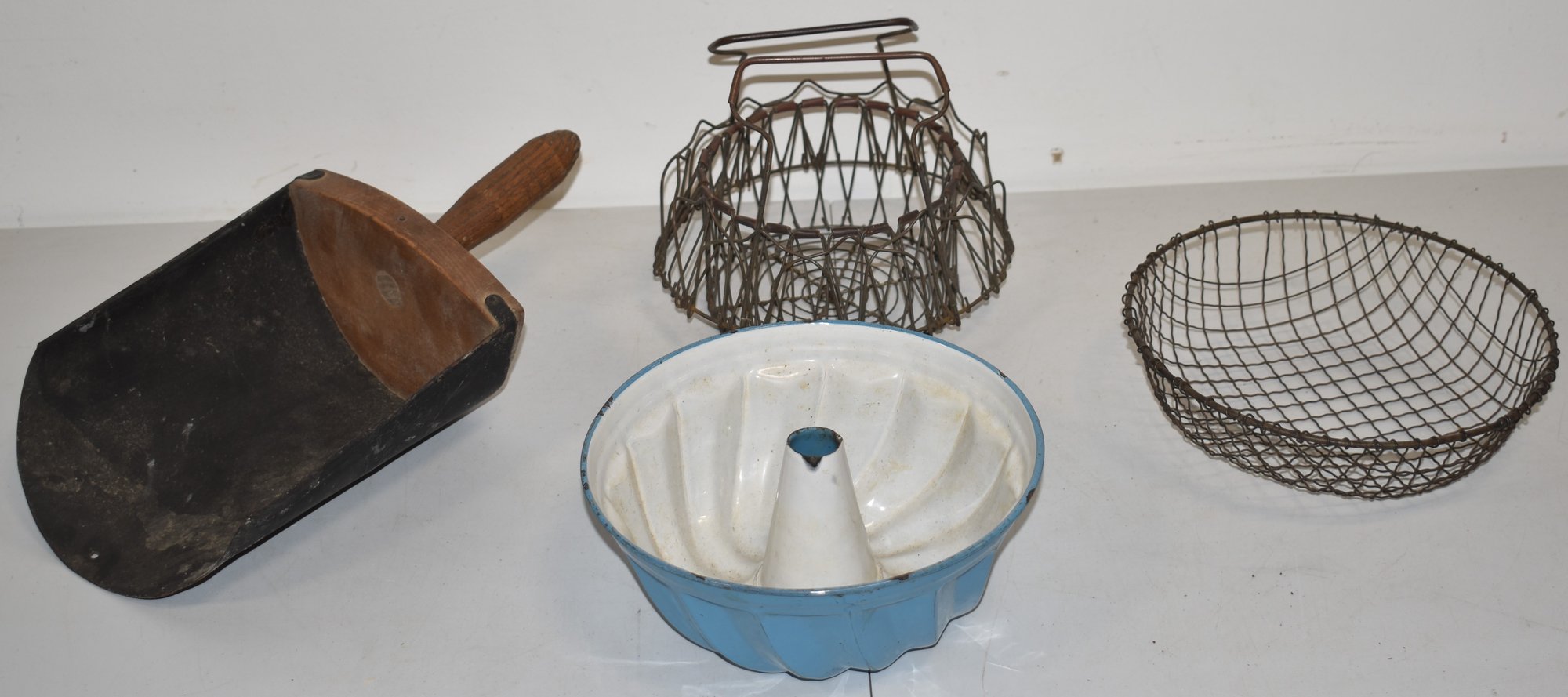 LOT INCLUDES 8" BLUE ENAMEL TURKSHEAD MOLD, 8 1/2" WHITE BASKET, COLLAPSIBLE WIRE EGG BASKET & 13": METAL SCOOP W/ WOODEN HANDLE - WEAR & IMPERFECTIONS