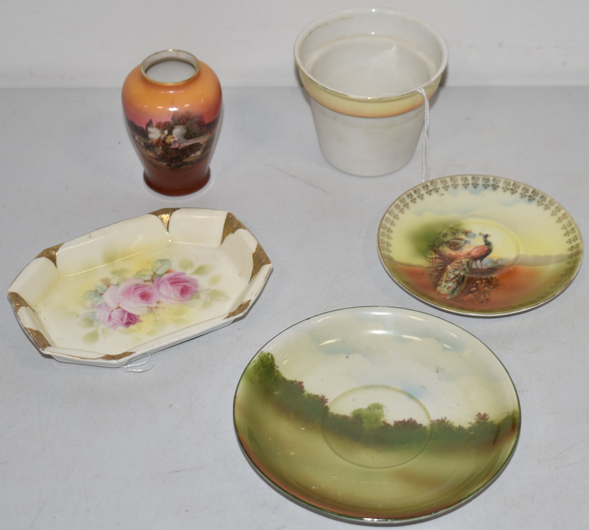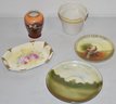 (2) SAUCERS, 3" VASE W/ BIRDS, 5 1/4" ROSE DISH & INSERT - WEAR & IMPERFECTIONS