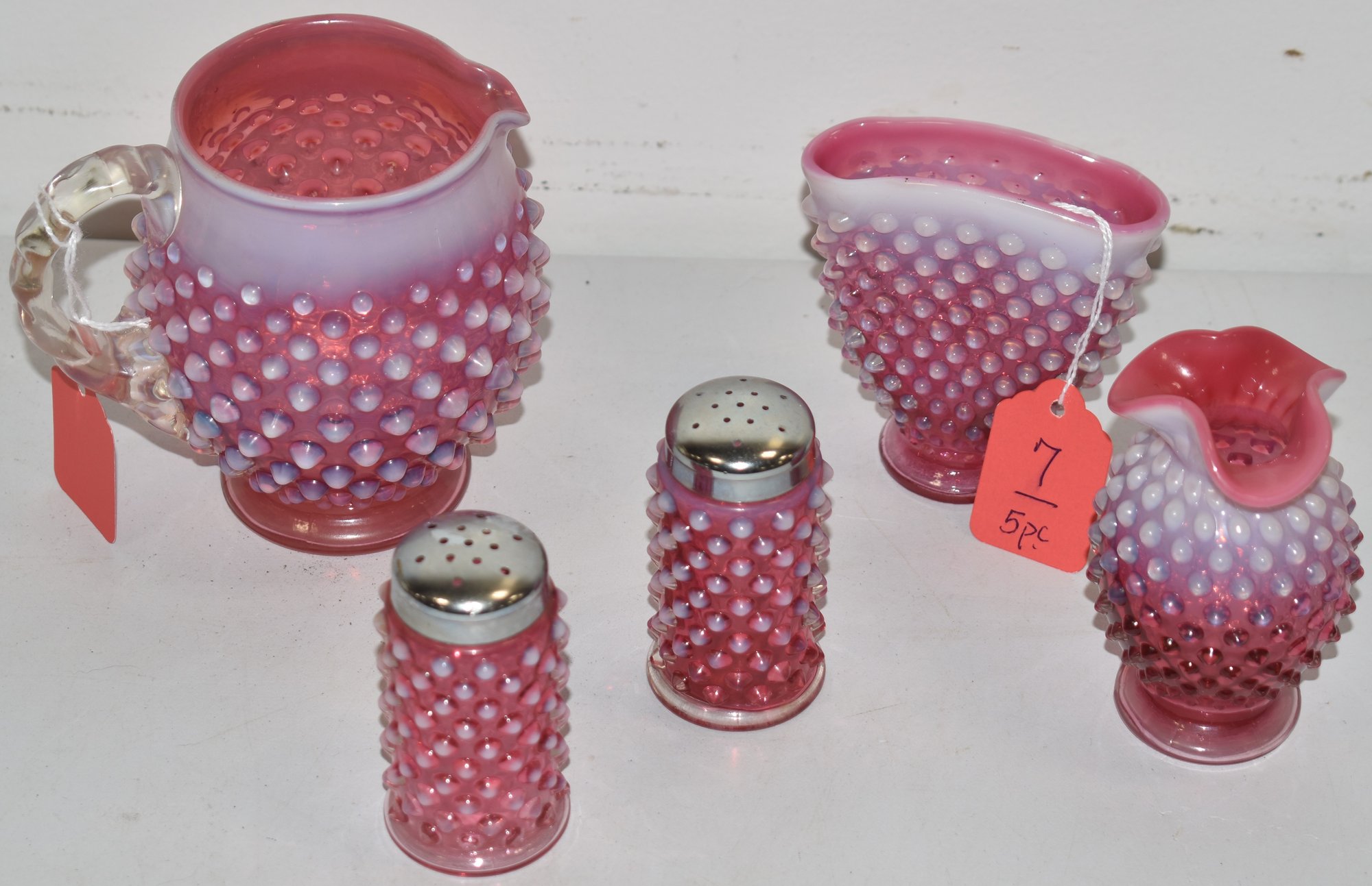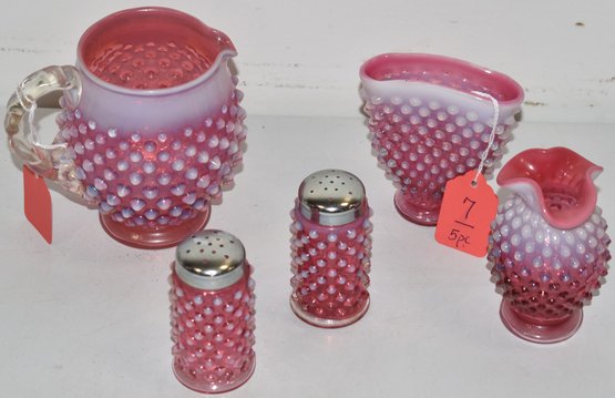 ALL FENTON HOBNAIL - PR. 3 1/4" SHAKERS, 3 1/2" FAN VASE, 4 1/2" PITCHER & 4" PINCHED VASE - WEAR