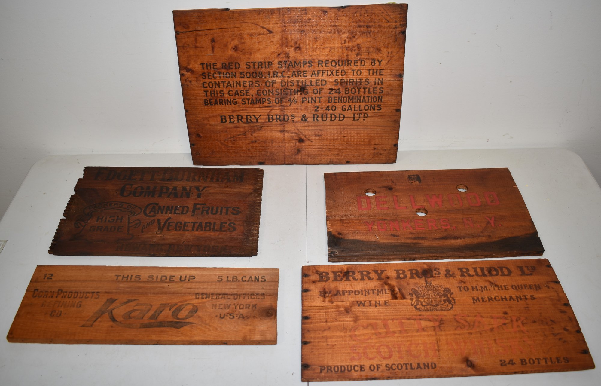 LOT (5) WOODEN CRATE PANELS W/ ADVERTISING - VARIOUS PRODUCTS & SIZES - CLEANED - WEAR & IMPERFECTIONS